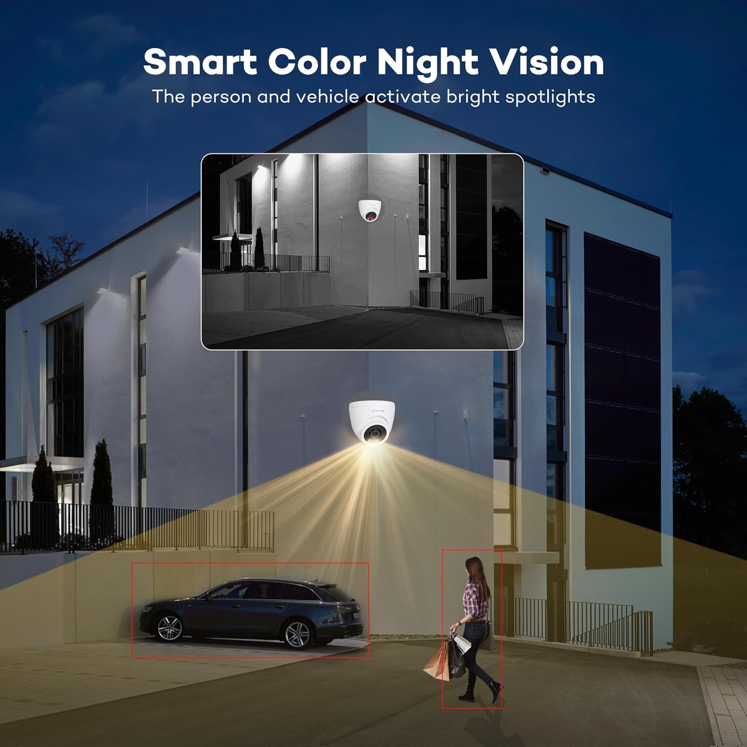 Intelligent Color Night Vision: AI human vehicle detection activates color night vision.