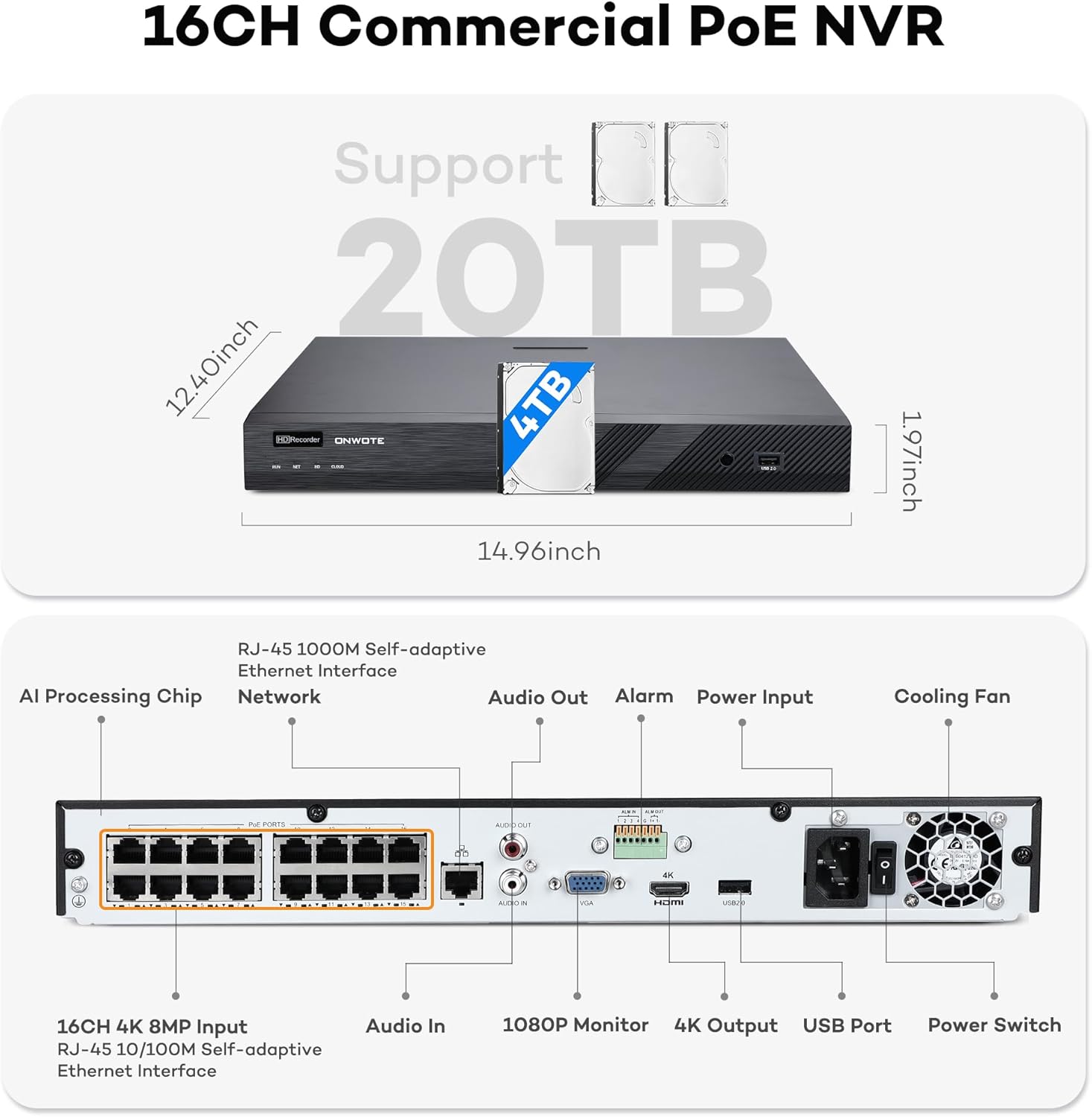 16CH 8MP NVR: Built-in 4TB HDD, 2 HDD ports support 20TB.