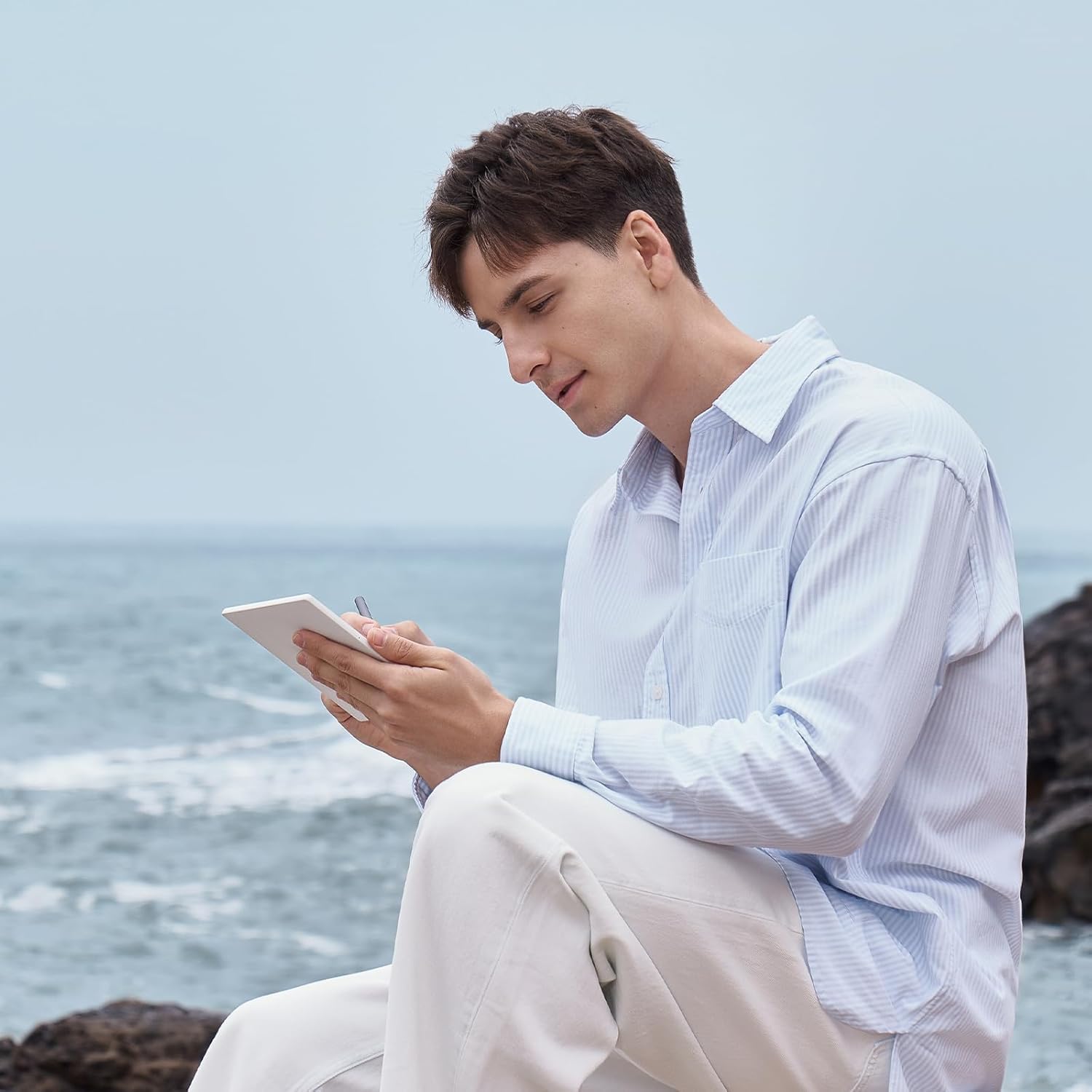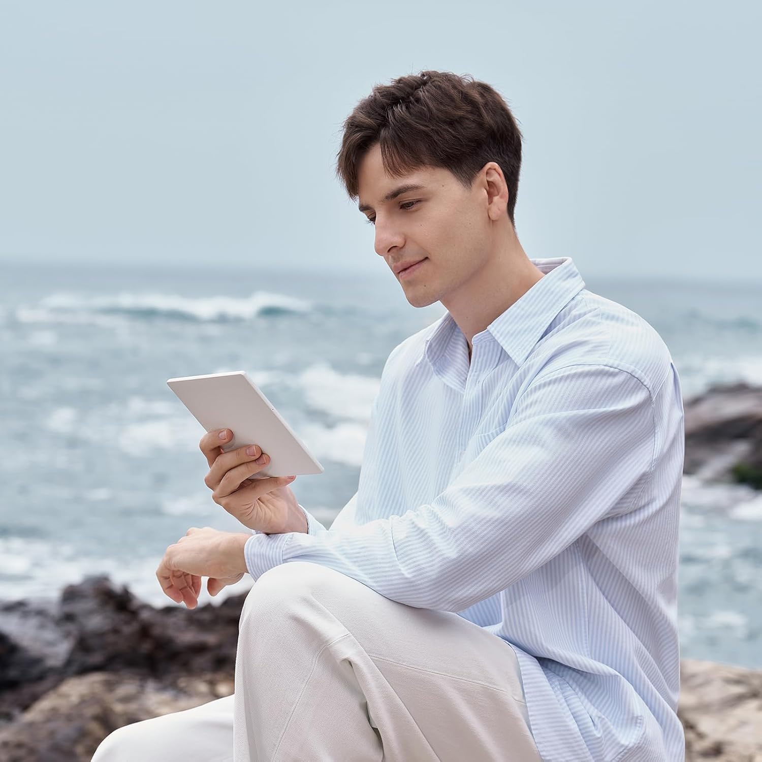 Read when and wherever it is with an adjustable front light. It shows evenly through the screen, gently in your eyes. Choose between white cold light for a focused reading or warm amber light for a nightlife atmosphere
