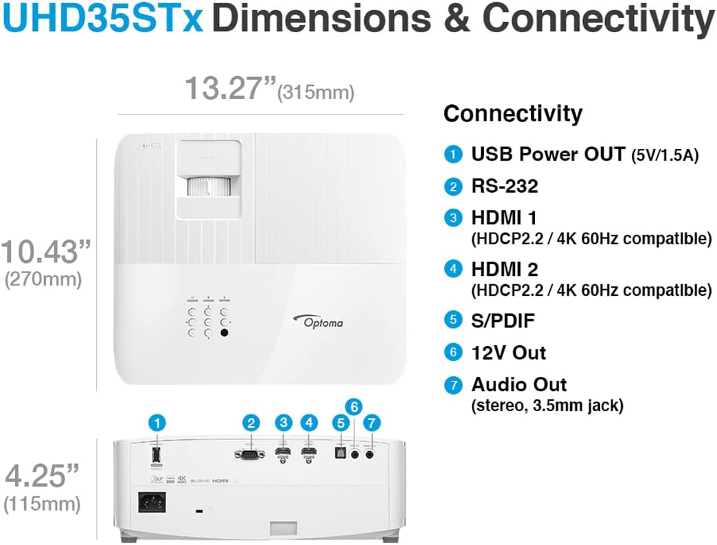 SHORT THROW FOR FLEXIBLE INSTALLATION: The UHD35STx is designed to be placed closer to the wall than standard throw projectors. Project a 100” image from just over three feet away and create an immersive experience in almost any space.