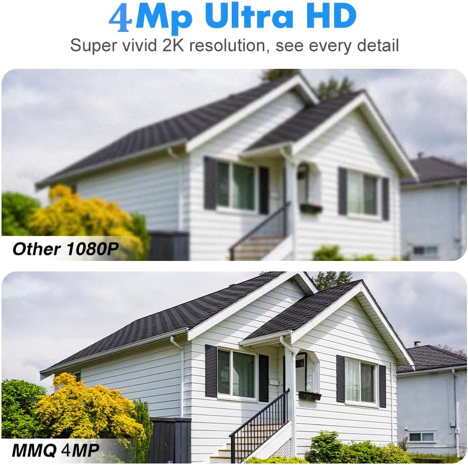 【2.5K Resolution & Cover Every Corner】—MMQ solar outdoor camera system captures clearer details in 2.5K HD resolution for greater viewing; the pan-tilt wireless camera can rotate 355° horizontally and 90° vertically to provide complete security coverage for every corner of your home