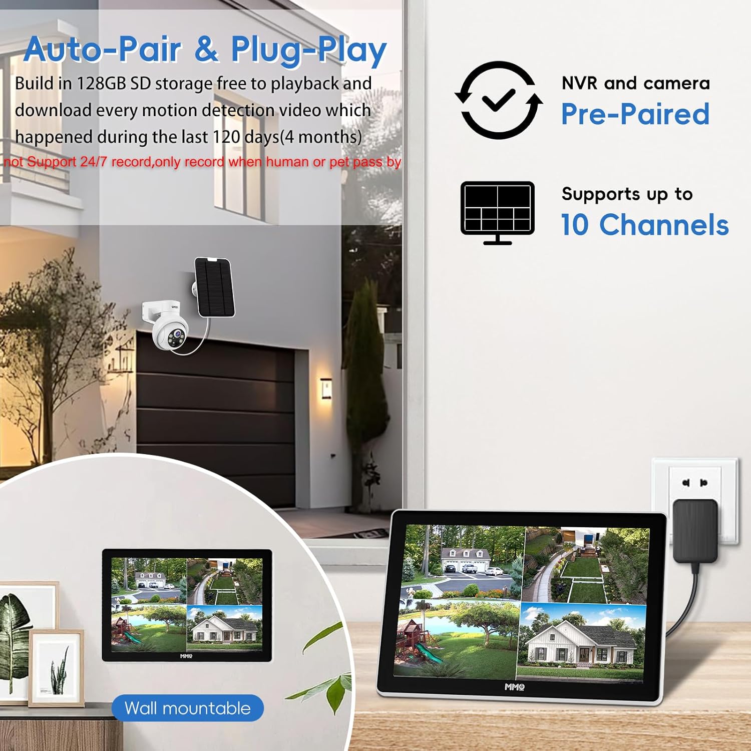 【No Monthly Fee & 128GB Local Storage】— Wireless solar camera system with 128GB built-in storage, free playback and download events to know what happened during the past 120 days (4 months). Cloud storage is optional