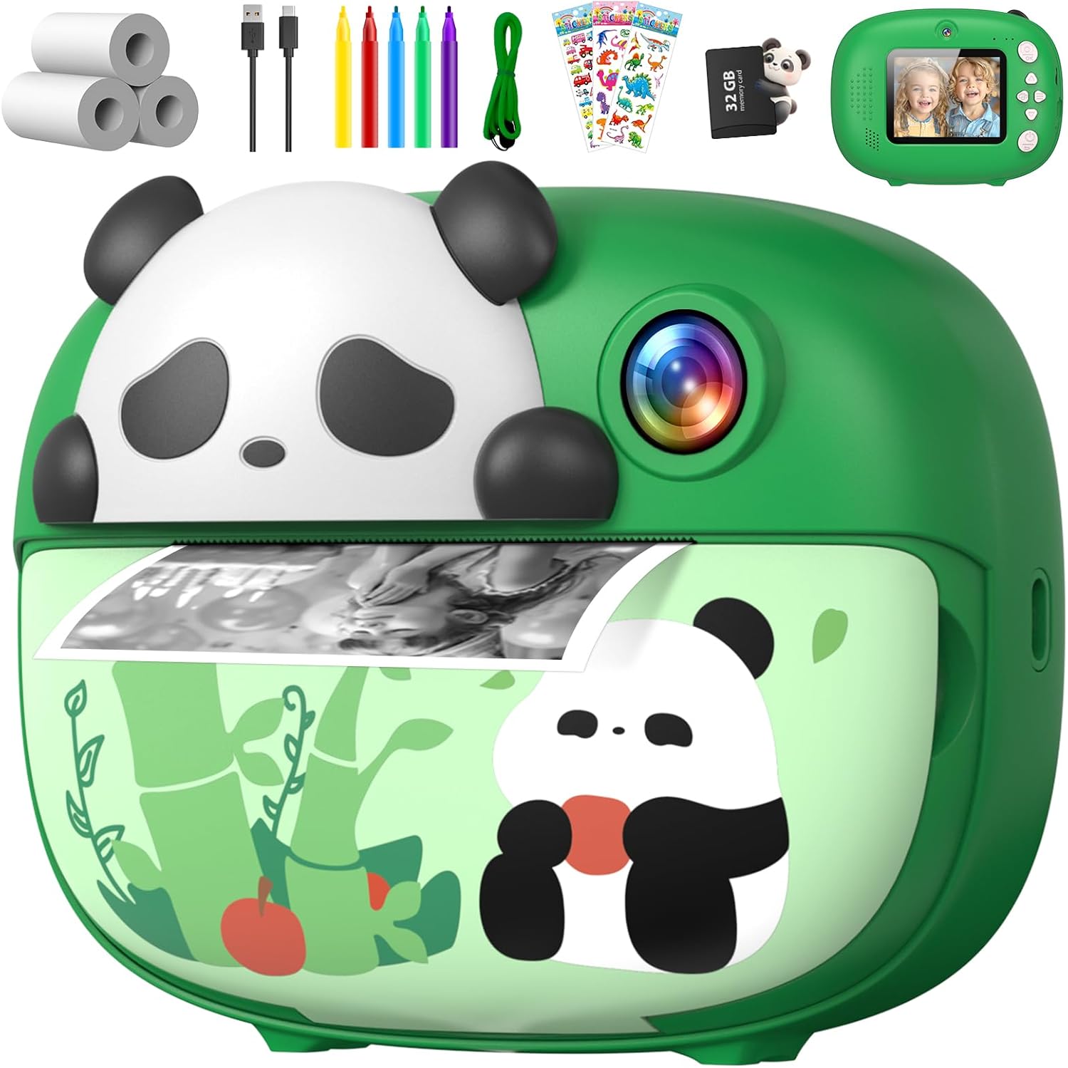 WHAT YOU GET: Kids Instant Camera*1/32GB SD Card*1/Color Pen*5/Printing Paper*3/Data & Charging Cable*1/Welcome Guide and Friendly Customer Service.