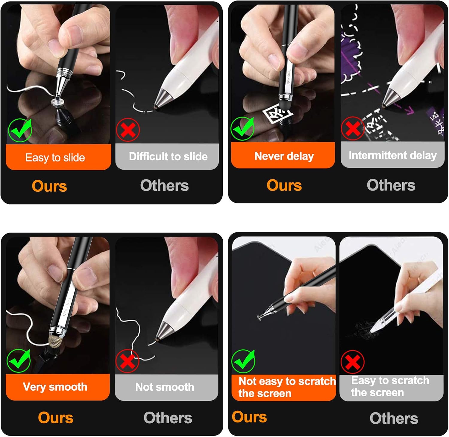 Universal style 4-EN-1: Penyeah Stylus Pen for touch screen include 4 tips of tactile screen optical pencil: 1 x 0.27 “Transparent disc tip; 1 x 0.27” fiber mesh fiber; 1 x 0.2 “rubber tip and 1 x 0.27” rubber tip; In addition to a smooth black ink ball pencil. A Stylus offers 4 different using experience