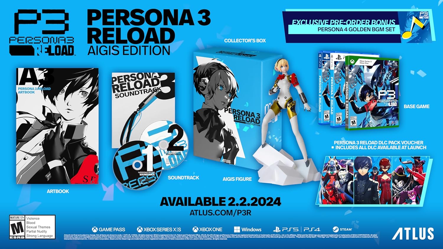 Aigis Edition includes: base game, Persona 3 Reload DLC pack voucher, art book, soundtrack, and Aigis figure.