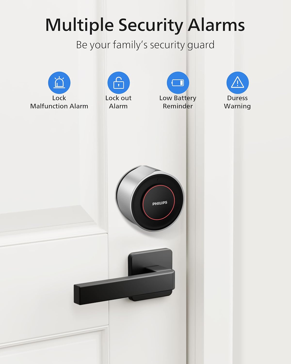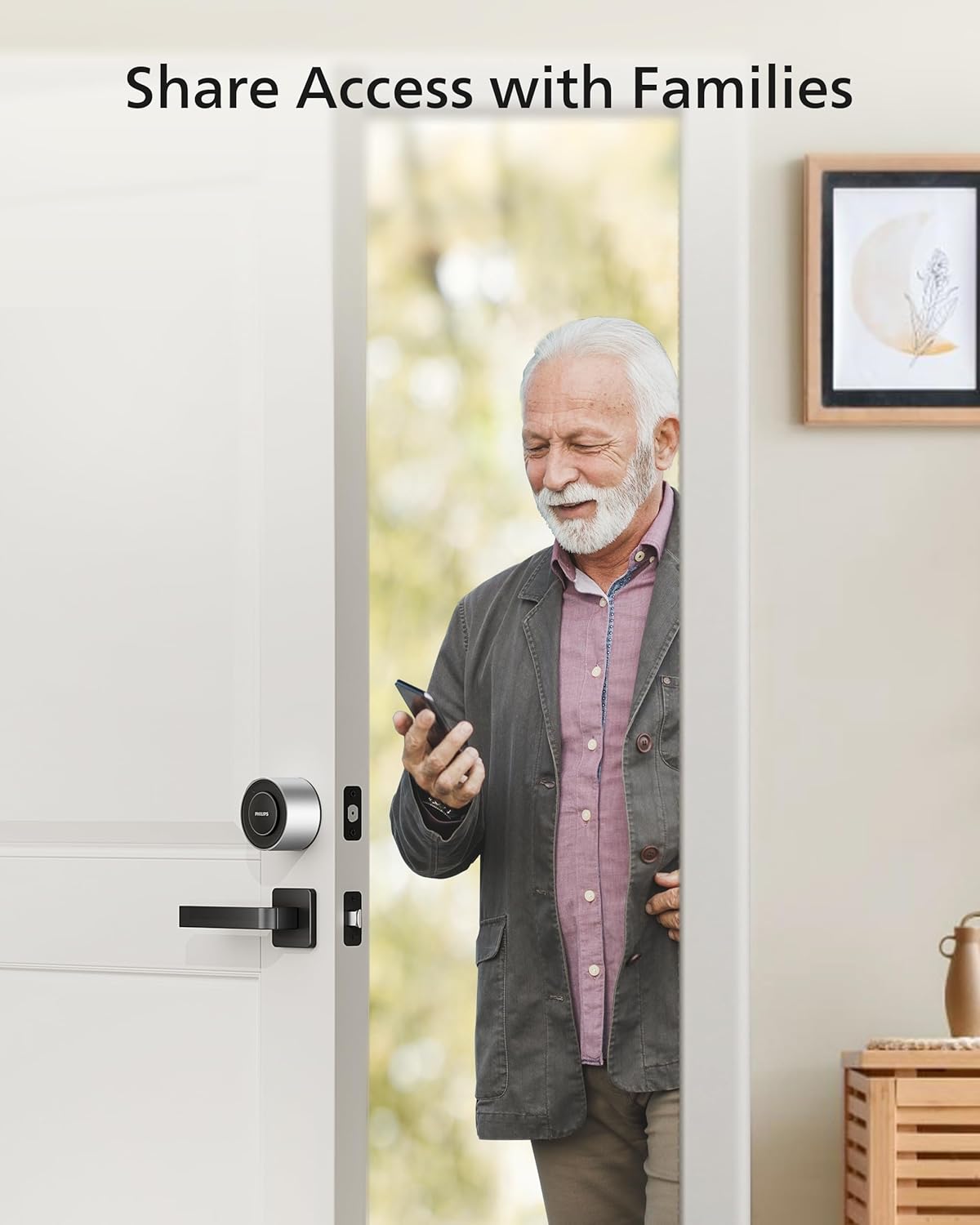 Real-time notification and monitoring: The Philips Home Access app will send you real-time notifications when your door lock is unlocked or locked. Additionally, the locking and unlocking events of the smart deadbolt lock are recorded in the app in real-time, allowing you to check at any time, when and who did it. Stay informed to maintain control over your home security.