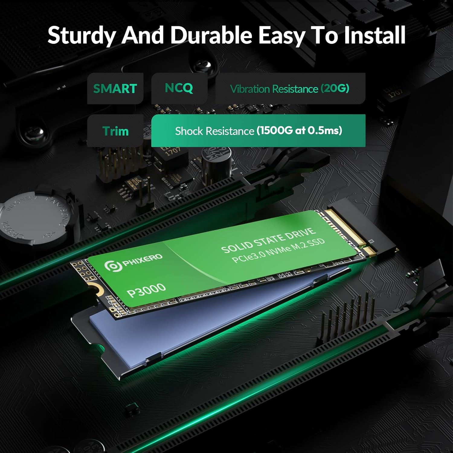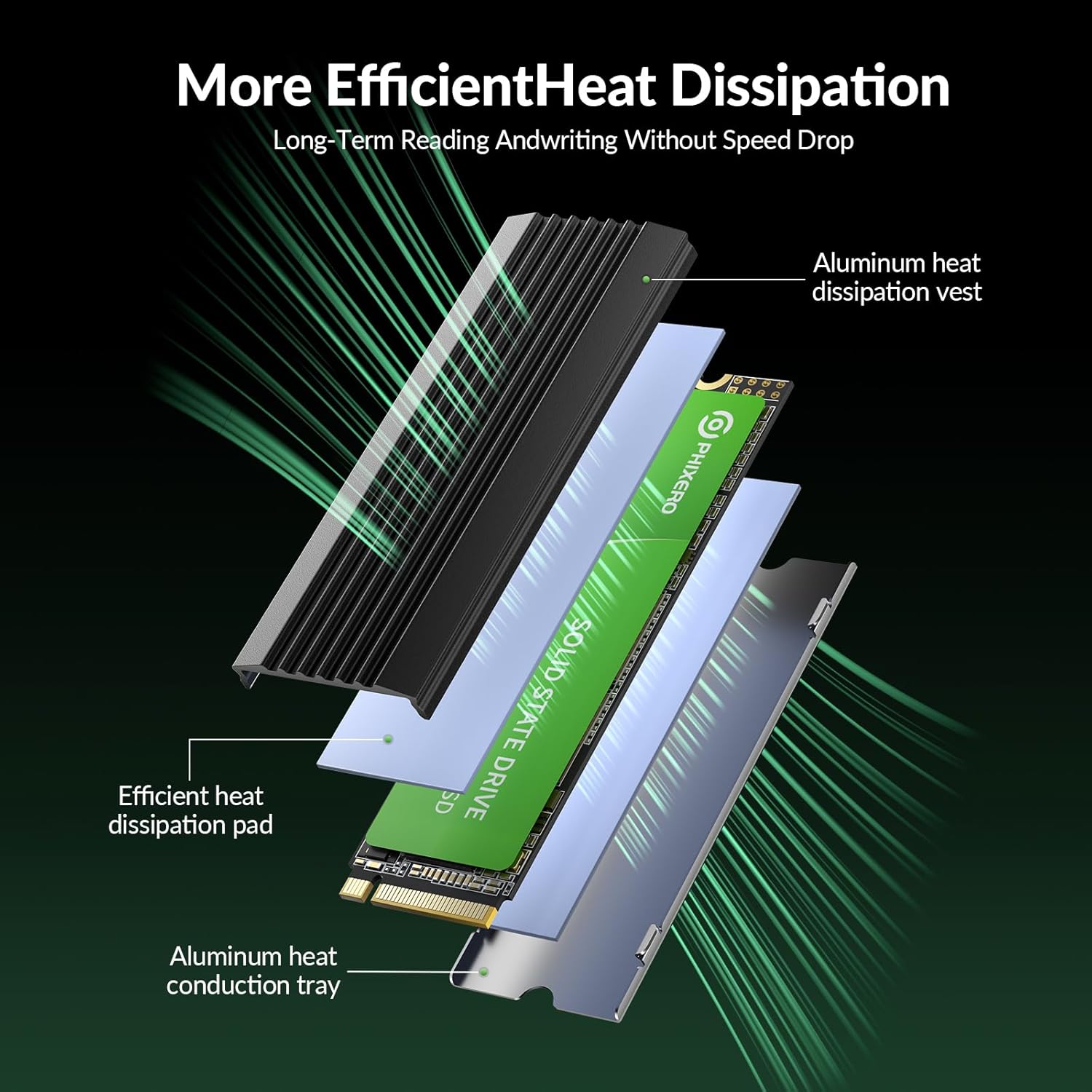 Efficient Thermal Insulation Design: PHIXERO M.2 SSD includes a 2280 NVMe SSD, an aluminum cooling base and vest, and a silicone thermal pad*2 that provides efficient heat dissipation, ensuring long-lasting and sustainable operation. high performance of the 2TB SSD, while extending its useful life and the security of your data