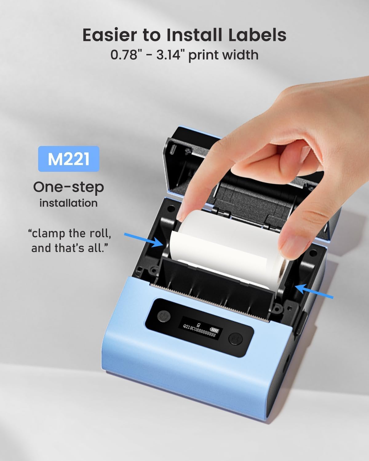 EASIER TO LOAD LABELS 👉 Compared to the previous generation, we have improved the installation structure of the label roll, eliminating the need for the tedious process of dismantling and installing a separate label fixer from multiple different parts. The new fixer is integrated with the M221 label printer, making loading easier; All you need to do is insert the label roll and secure it with the side deflectors. No more annoying!