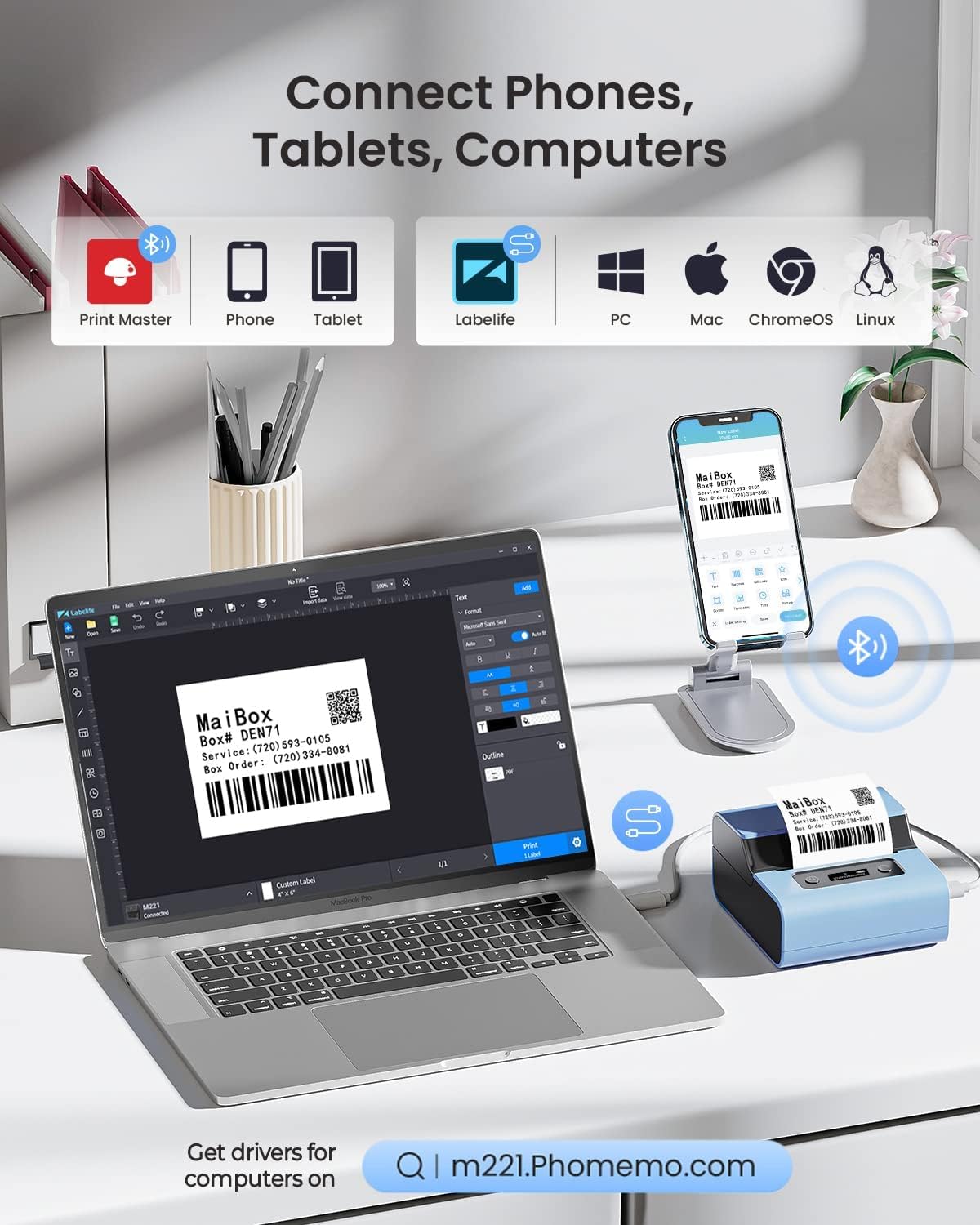 MADE FOR PHONES, TABLETS AND COMPUTERS 👉 The Phomemo M221 label maker is equipped with stable Bluetooth 4.2, making it compatible with phones and tablets, allowing for a quick connection in just 2 seconds. Additionally, the label printer can be connected to a macOS or Windows computer via USB.
