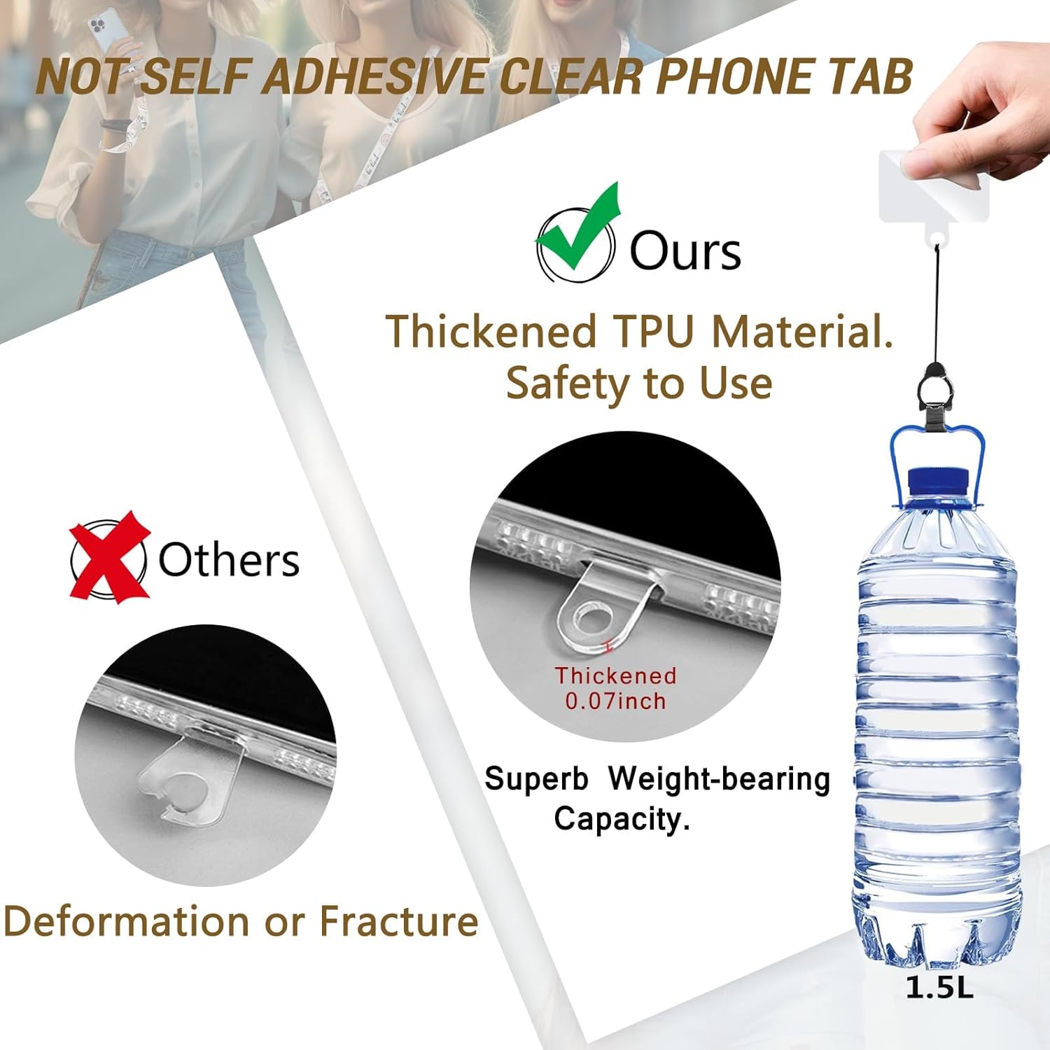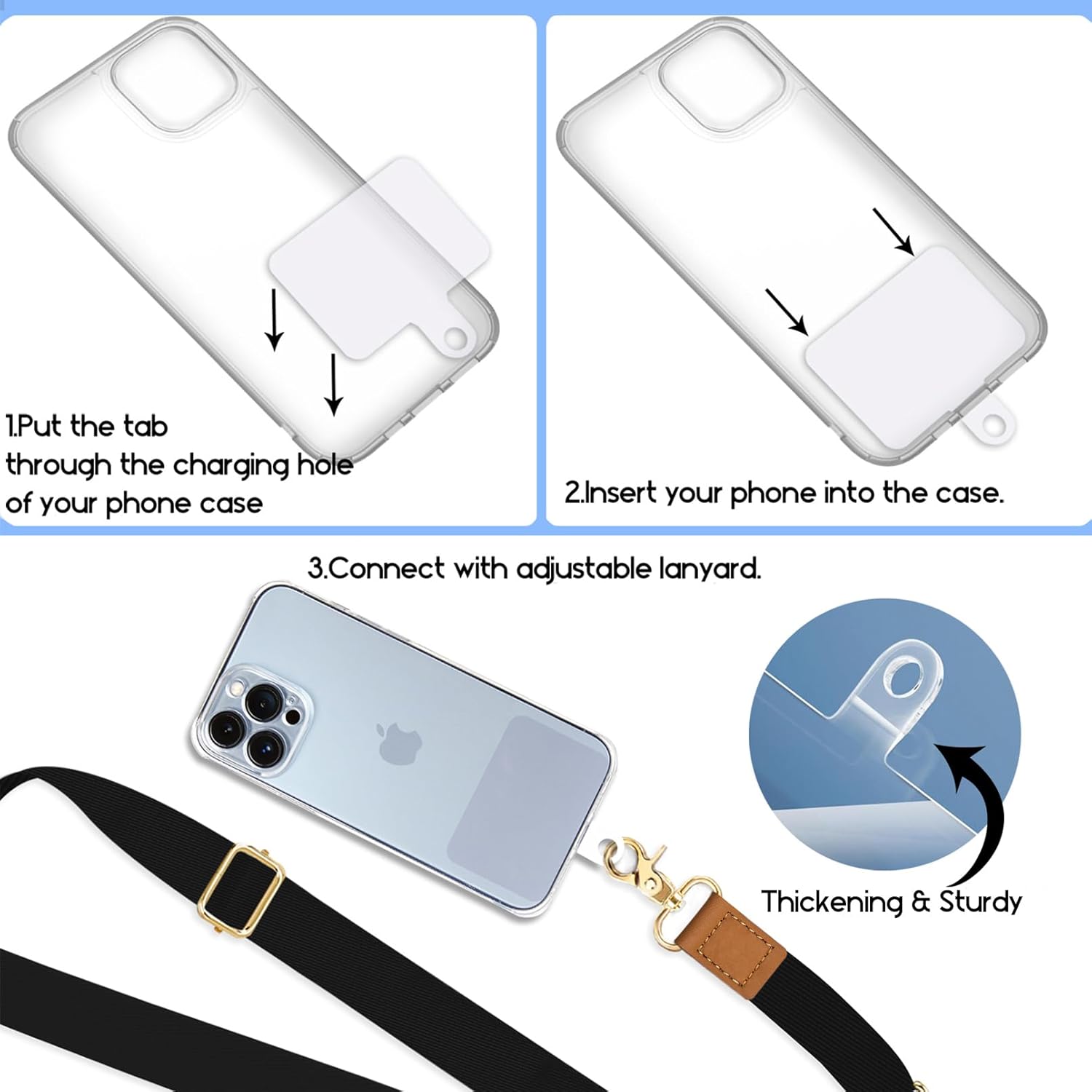 The cell phone lace set includes 1 adjustable cross -body cell phone cord, 1 wrist strap, 2 phone belt tabs and 2 key rings.