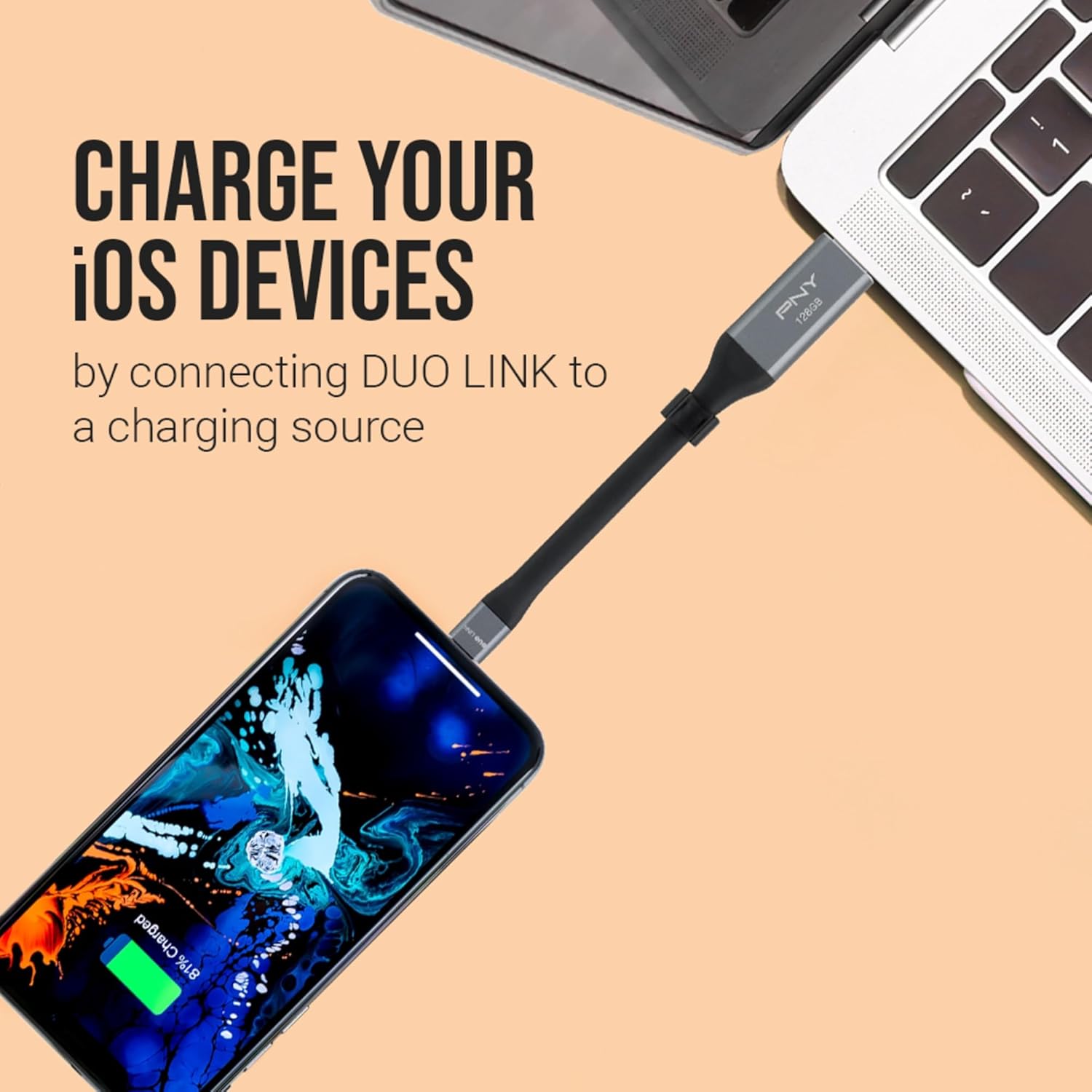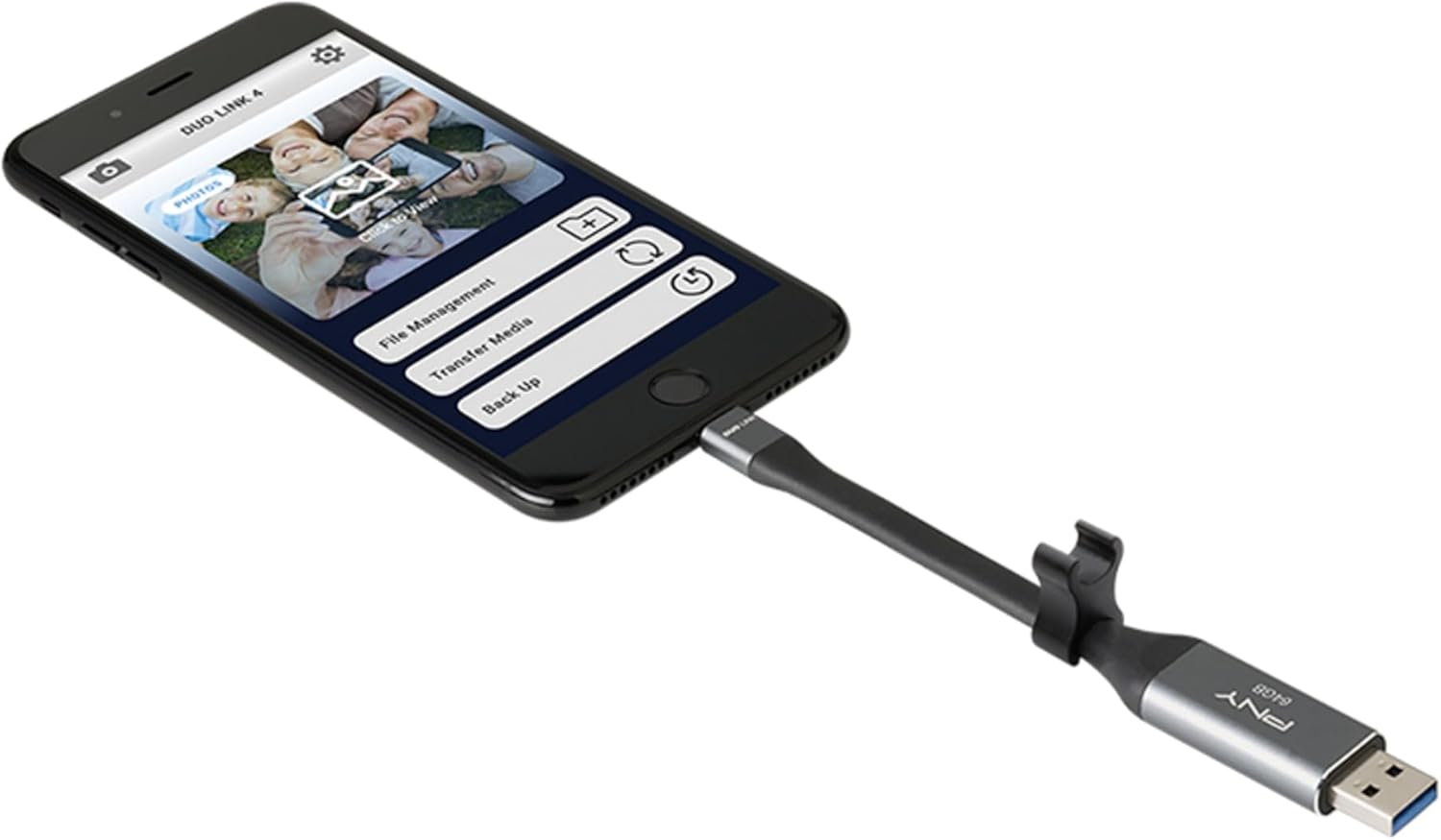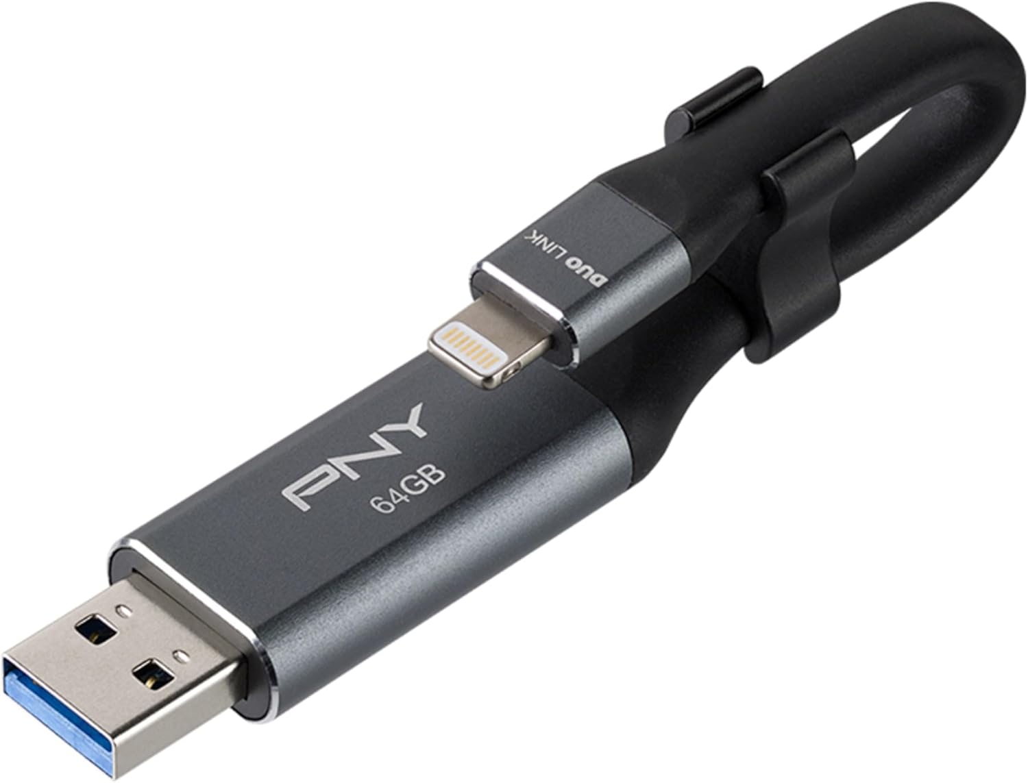 The PNY DUO LINK 64GB OTG USB 3.0 Flash Drive lets you free up space on your iPhone and iPad, sync and share content between devices, back up contacts, download and store videos, photos and more via the free, easy-to-use app, while simultaneously charging your iOS devices.