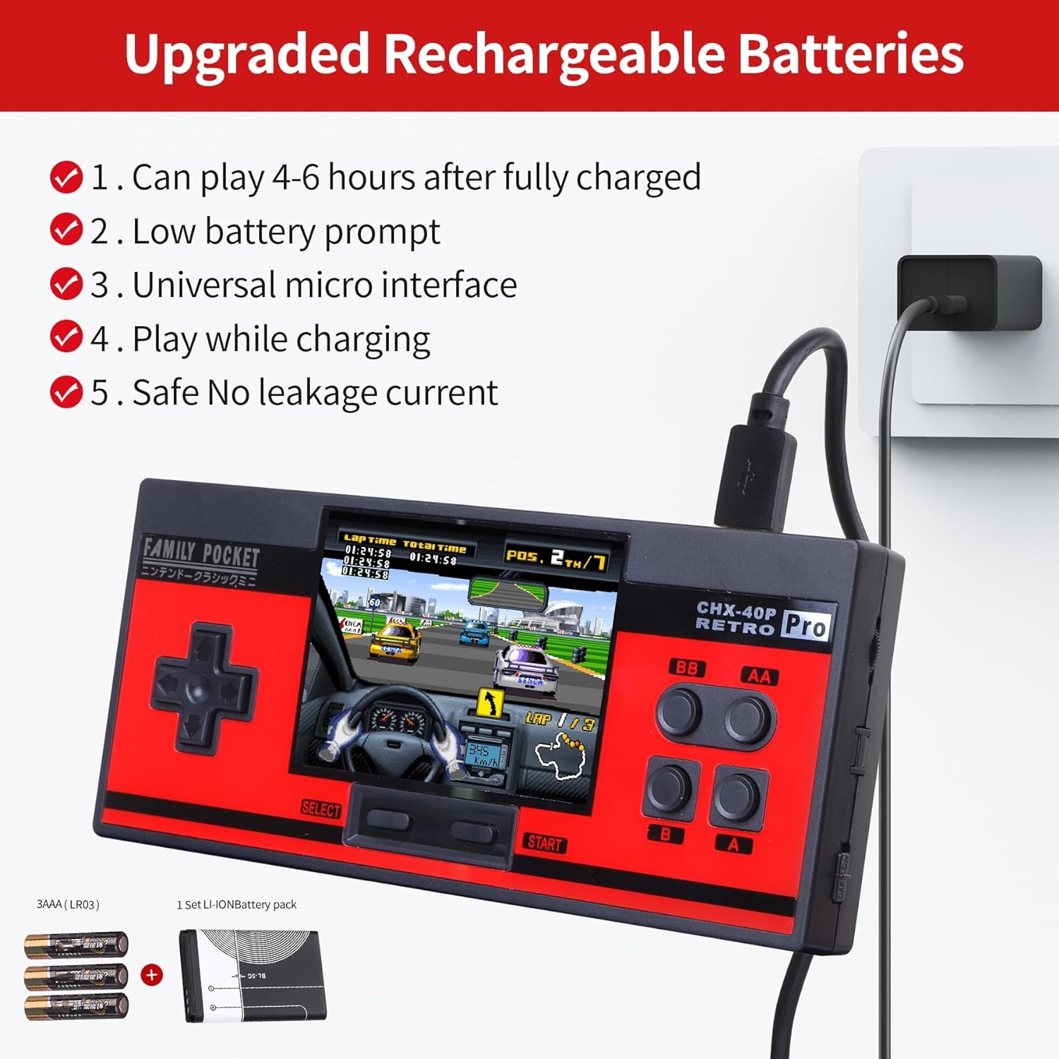 【Long Use Time】Built-in 800mAh large capacity rechargeable lithium battery, providing a constant flow of power for your child's happiness. Save money by not having to buy and replace batteries frequently. The game can play up to 5 hours each time fully charged. The flexible power supply mode will bring your child a lot of joy and happiness during the trip or long trip. (Note: Please fully charge the battery before first use.)