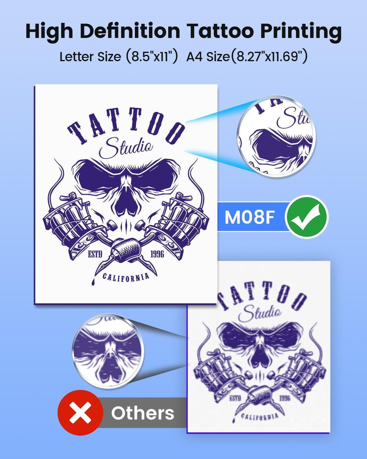 Optimal yield with certified consumables: Phomemo M08F thermal printer requires a specific type of thermal paper to achieve best performance. The thermal paper used by the M08F Mobile Printer differs from regular paper. However, if you need to print tattoos, the regular tattoos transfer paper will be sufficient