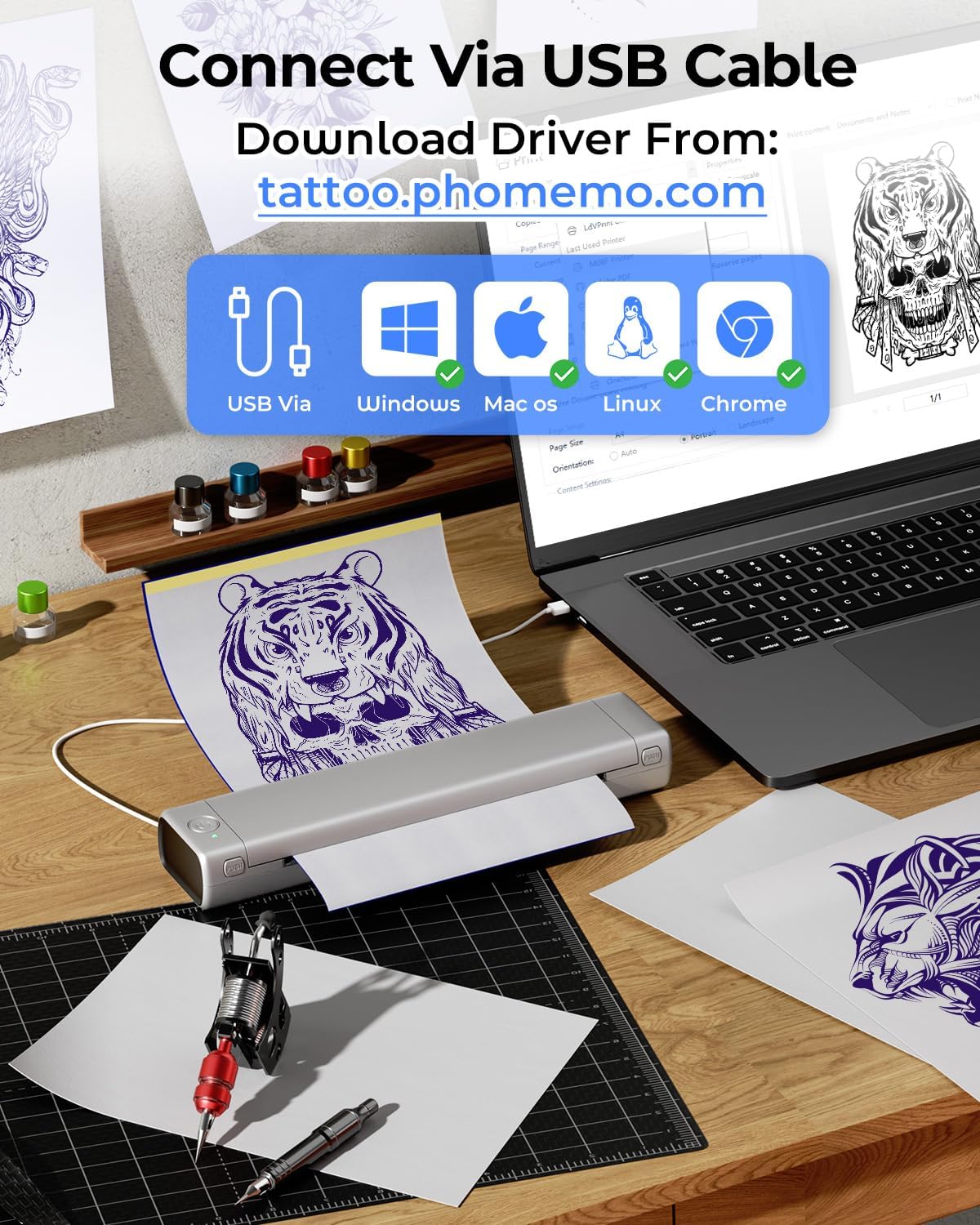 Powerful Phomemo application, say goodbye to complicated printing processes, our Phomemo application allows the impression of images and documents with a single click. Unlike the traditional tattoo printer machine that requires white paper printing before copying, you can print your designs instantly with our application. In addition, to obtain optimal printing results, we recommend using the Phomemo tattoo transfer paper. Alternatively, connect to your portable PC/computer through a USB cable and print directly. (PC/laptop printing download the controller: M08F.phomemo.com)