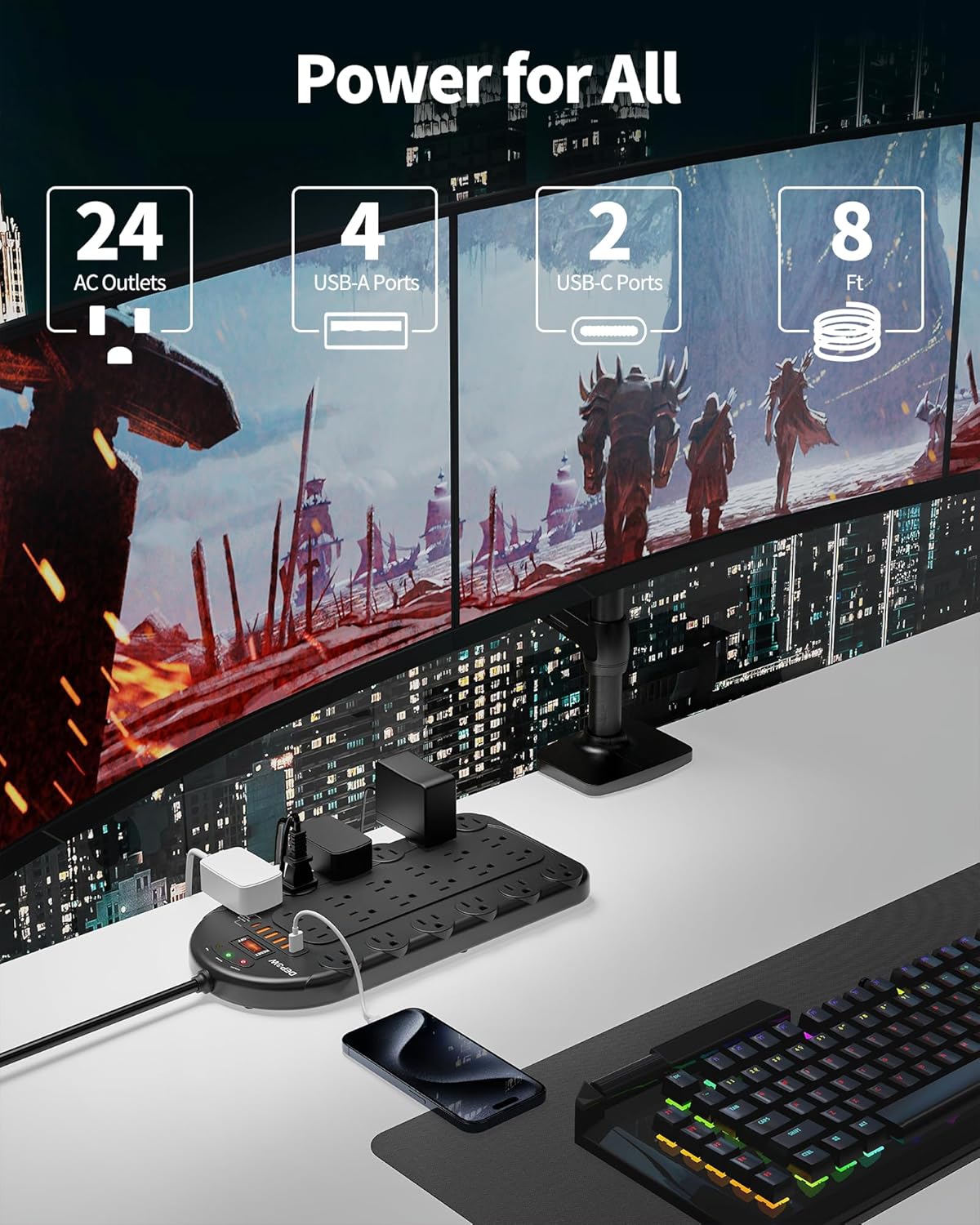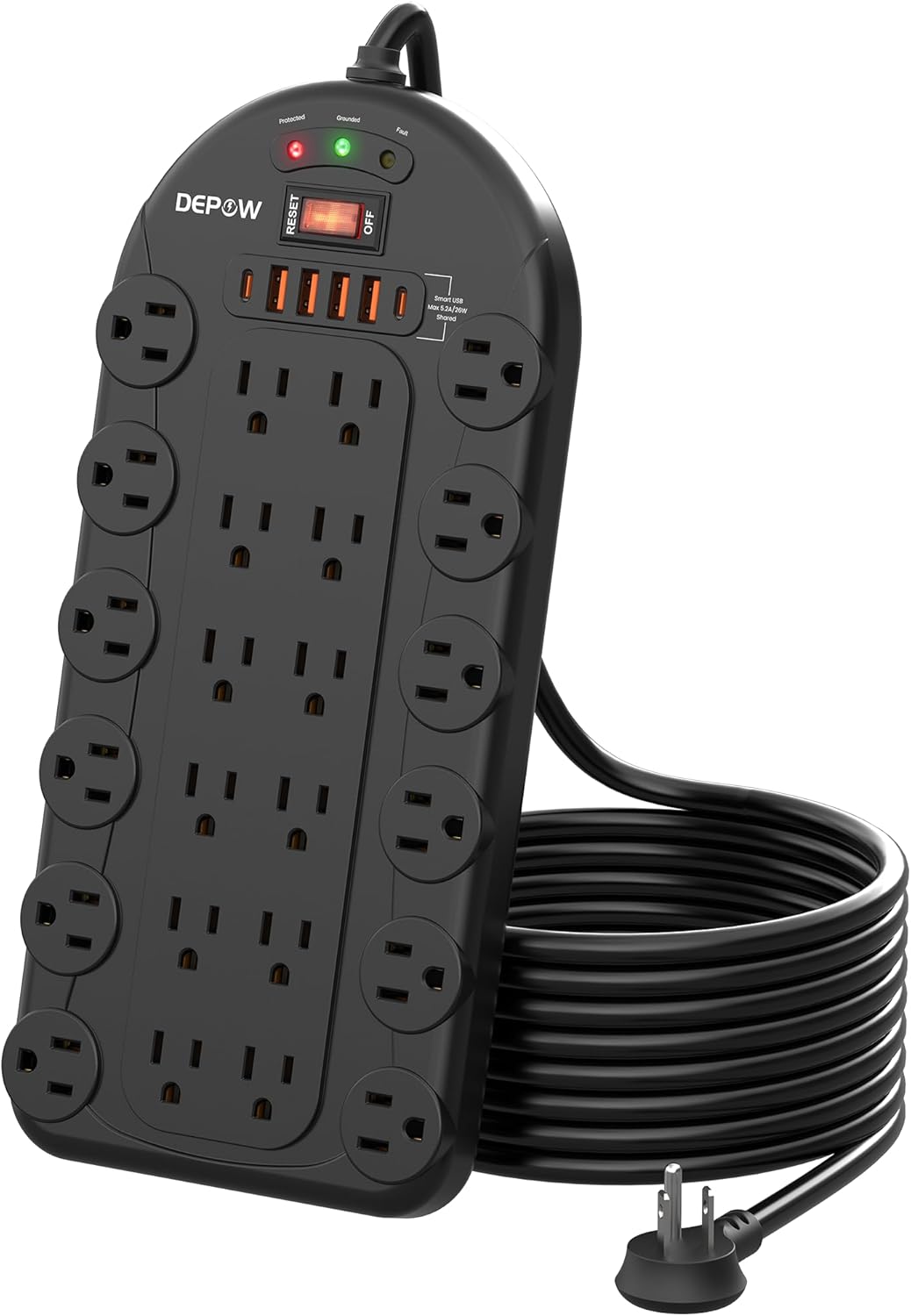 【30-in-1 Power Station】DEPOW power strip surge protector is the ultimate power hub for your office or home. With its 24 grounded outlets (1875W/15A), it provides plenty of space to plug in all your electronic devices. The power strip also features 6 USB ports (2 USB-C ports) with a shared 5.2A/26W output, allowing you to charge multiple devices at once.