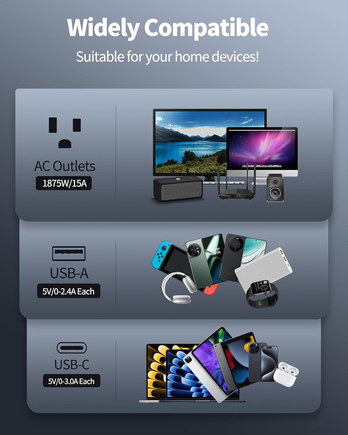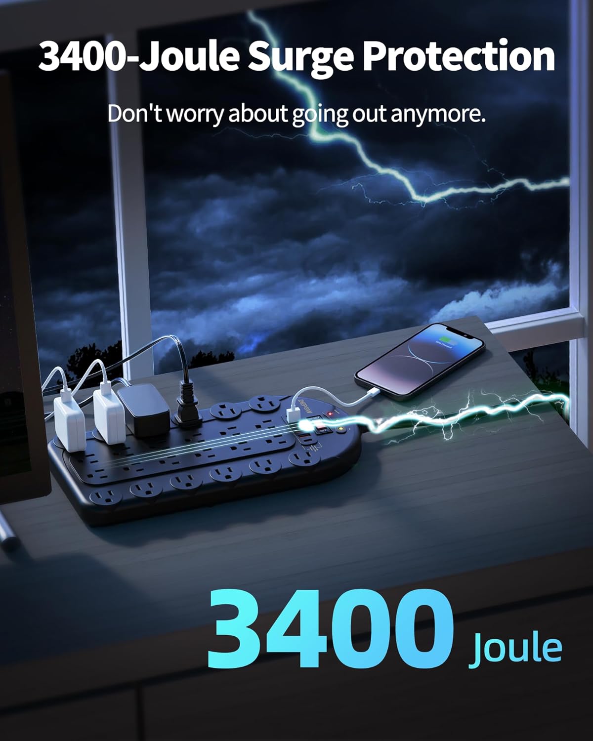 【Protect Your Devices】ETL certified. This power strip also features 3400J surge protection to protect your valuable electronic devices from power fluctuations and surges. This surge protected power strip ensures safety and versatility, ideal for home, office, or game room.