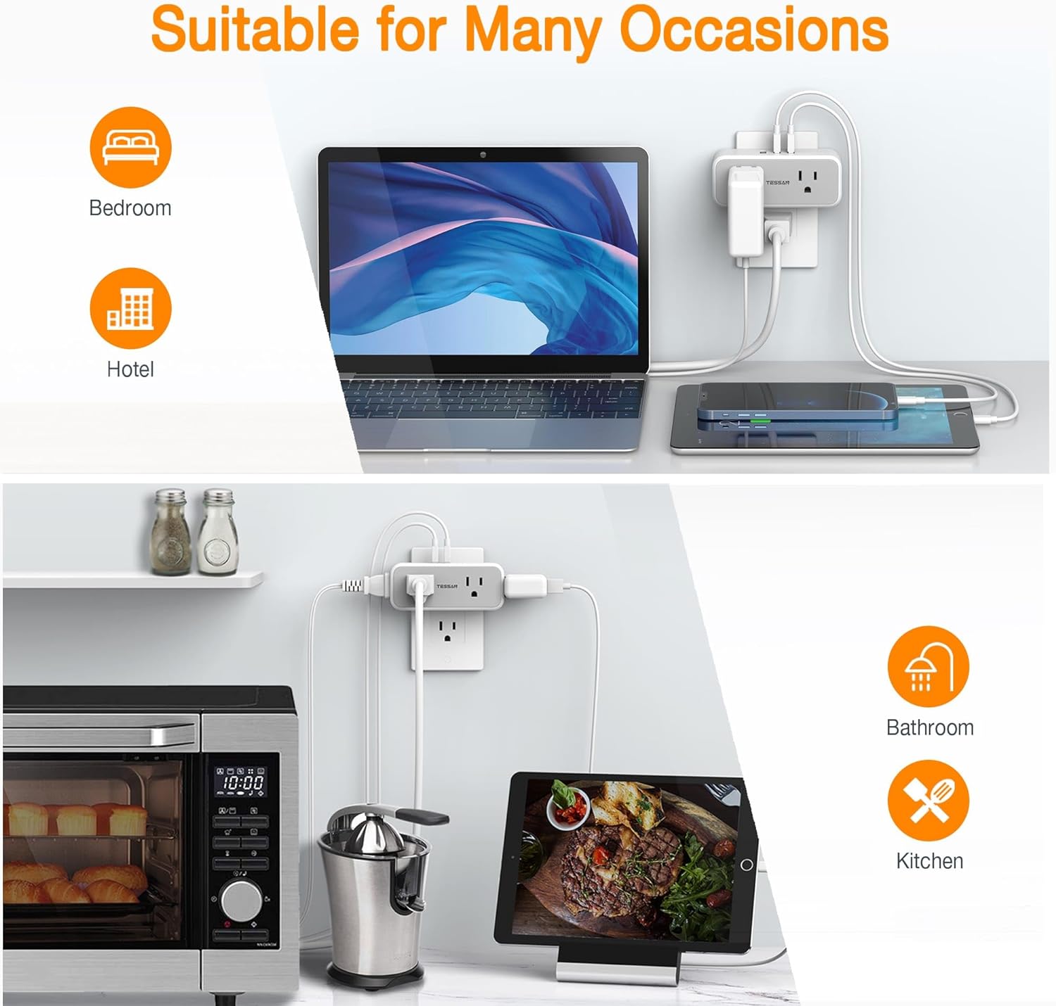 Surge Protector with USB Ports: The power of the wall outlet extender reaches a maximum of 1875W; the multi-outlet plug protects your expensive computers, hair dryers, shavers and other devices from power surges and voltage spikes, providing a safe and reliable charging environment