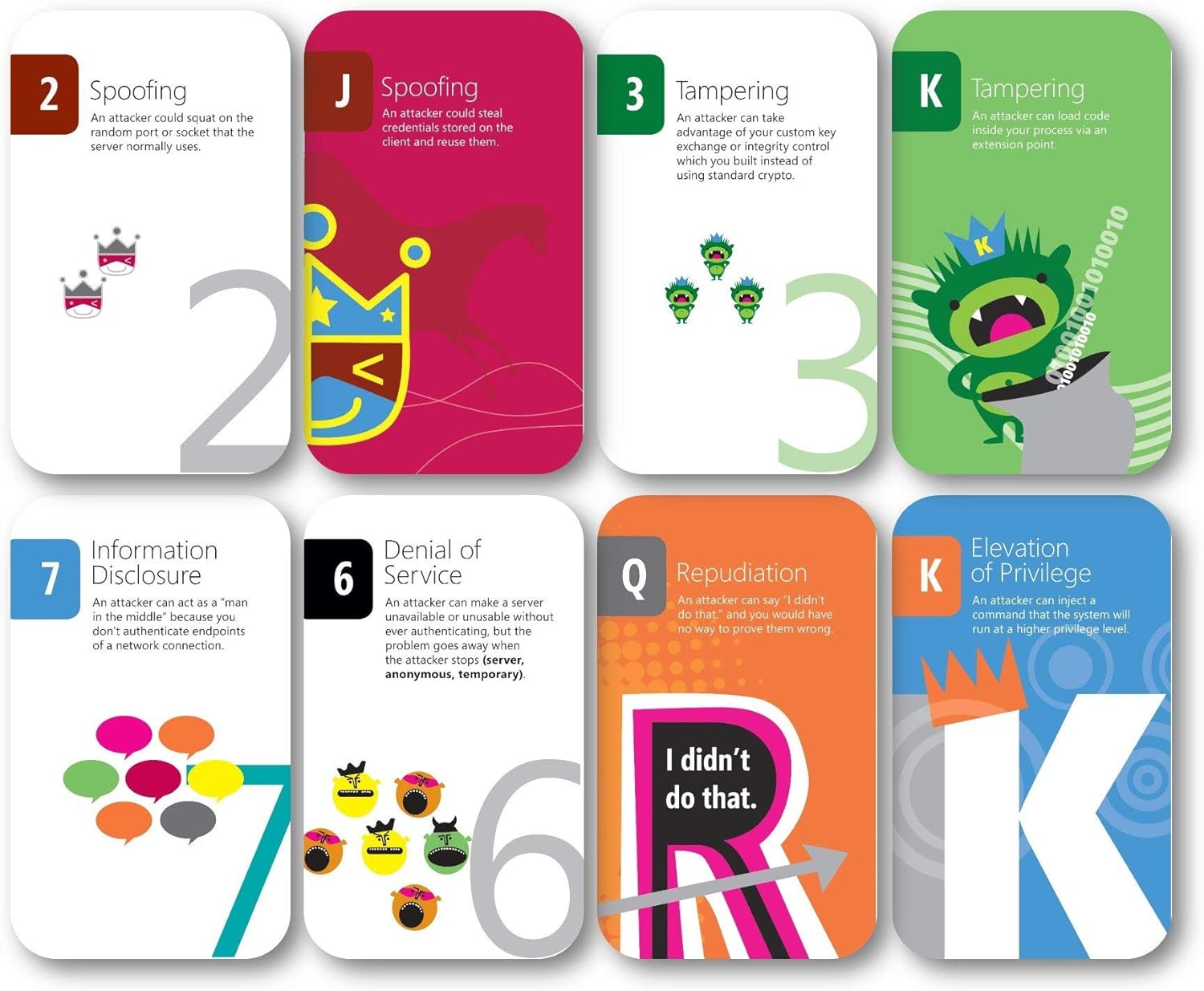 The 78 threat cards are divided into six suits based on the STRIDE mnemonic: impersonation, tampering, repudiation, information disclosure, denial of service, and elevation of privilege.