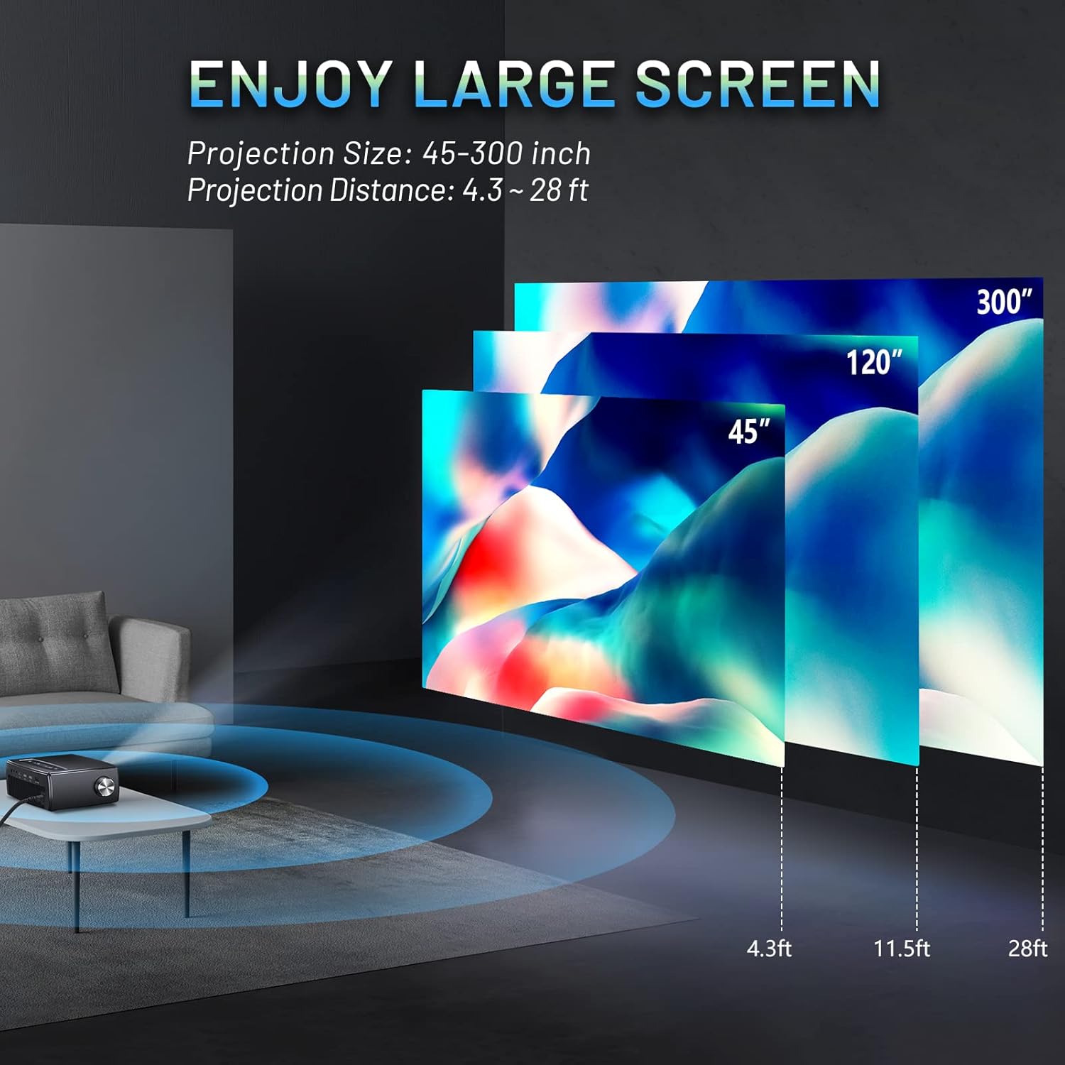 Support Wireless, Bluetooth and Dolby: With 2.4G/5G WiFi connection, the outdoor projector can mirror movies/videos/photos/games from your iOS or Android device to a big screen (NO NEED TO PURCHASE ADDITIONAL CABLES). With Bluetooth connection, the portable projector can be connected wirelessly to external speakers or Bluetooth headphones. Dolby audio improves the acoustic fidelity of the outdoor movie projector. The zoom function makes it easy for the projector to adjust the screen size from 75% to 100% remotely.