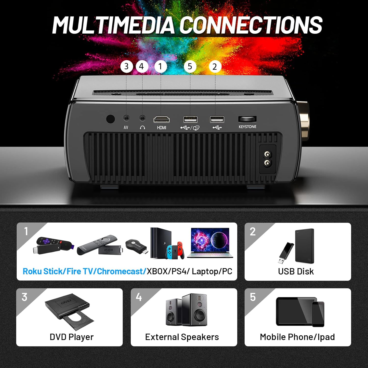 Connecting Multiple Devices & Low Noise: Equipped with HDMI/AV/SD/USB port, CLOKOWE YG661 home theater video projector can be successfully compatible with TV Box, Fire Stick TV, Chromecast, PC, Laptop, tablet, external speakers, Xbox, DVD player. , PS3, PS4, USB flash drive, media players, iPad, iPhone, Android smartphone, etc. With improved fan system and the application of innovative material, the mini bluetooth projector generates less noise. (4K partially supported)