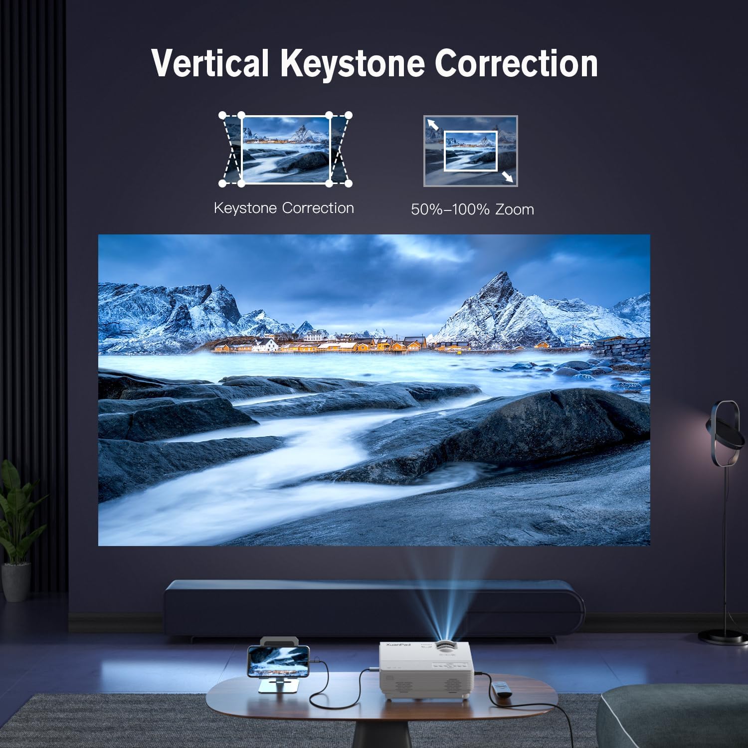 💖【Immersive Projection Size and Long Lasting Lamp】 XuanPad projector has a projection size of 30 to 200 inches and a projection distance of 1 m to 5 m. With an extra-large projection size of 200 inches, you can enjoy an immersive viewing experience and share great moments from movies, games, and sporting events with family and friends. The powerful heat dissipation system effectively extends the lamp life to 55,000 hours and allows you to enjoy entertainment for longer.