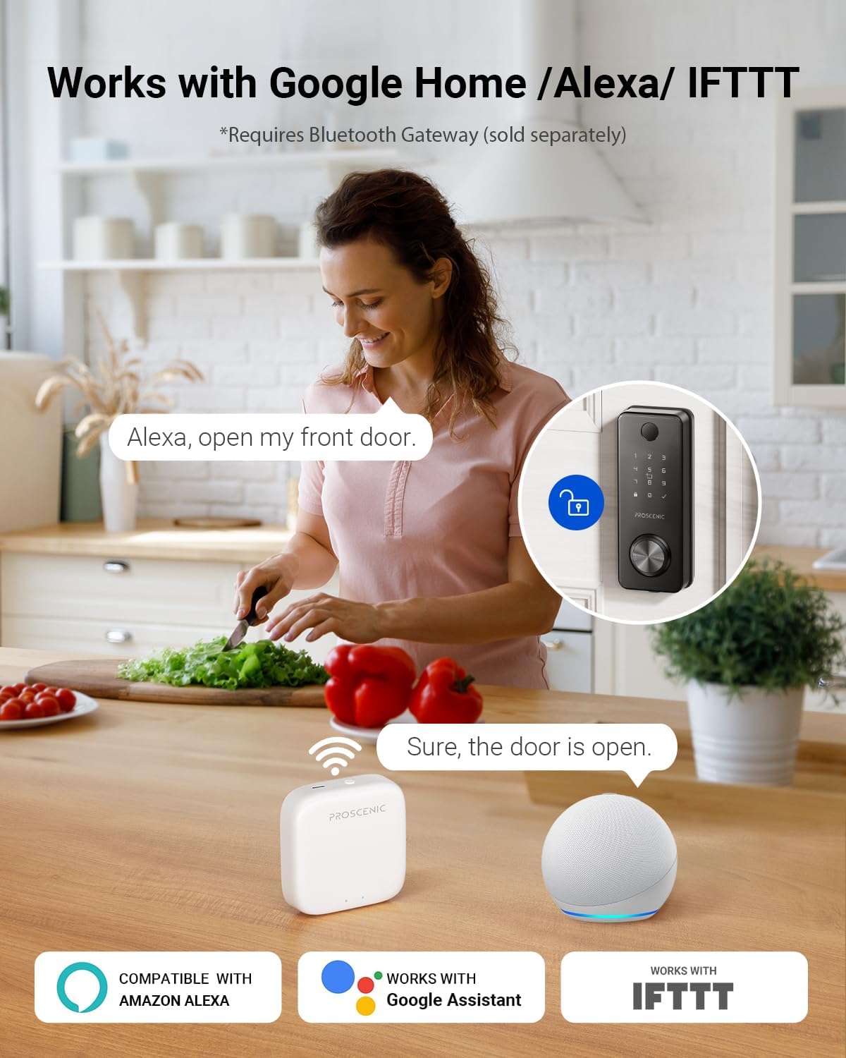 ➤ Open your door using fingerprint, phone app, passcode, key, remote control and voice (Alexa/Siri/Google/IFTTT). *Bluetooth gateway (sold separately) is required for remote control (outside of Bluetooth range) and voice control.