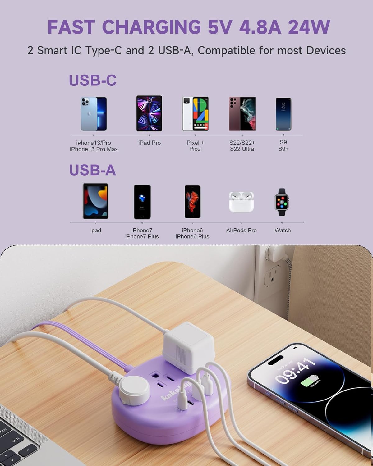 【Linda Power Strip with USB C】 Ports Compare with other 15W feed strips, the Purple Power Strip Provice 2 USB-C for Apple devices, each can load up to 5V/2.4a max. Multiple USB load station with smart load technology, can automatically detect its connected devices and can achieve faster load efficiency, which would load its devices without a variety of converters.