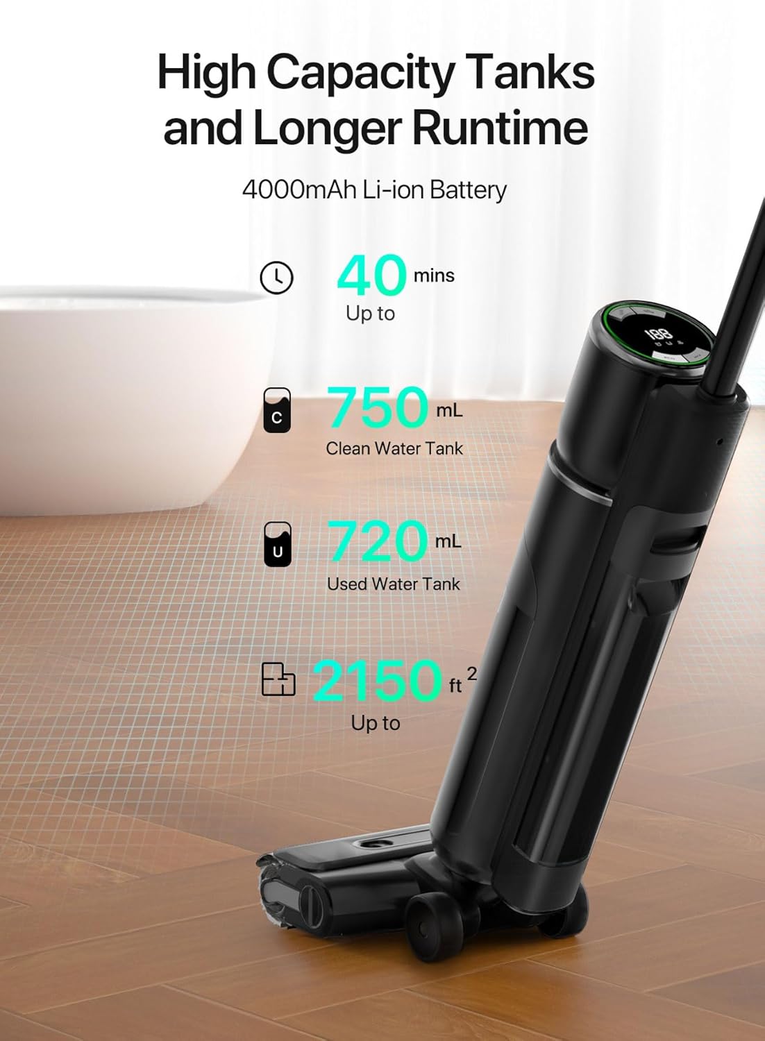 [Long Runtime] The large 750ml cleaning water tank and high capacity battery will allow you to clean for up to 40 minutes of operation and will automatically recharge the cleaner when you place it back on the base.