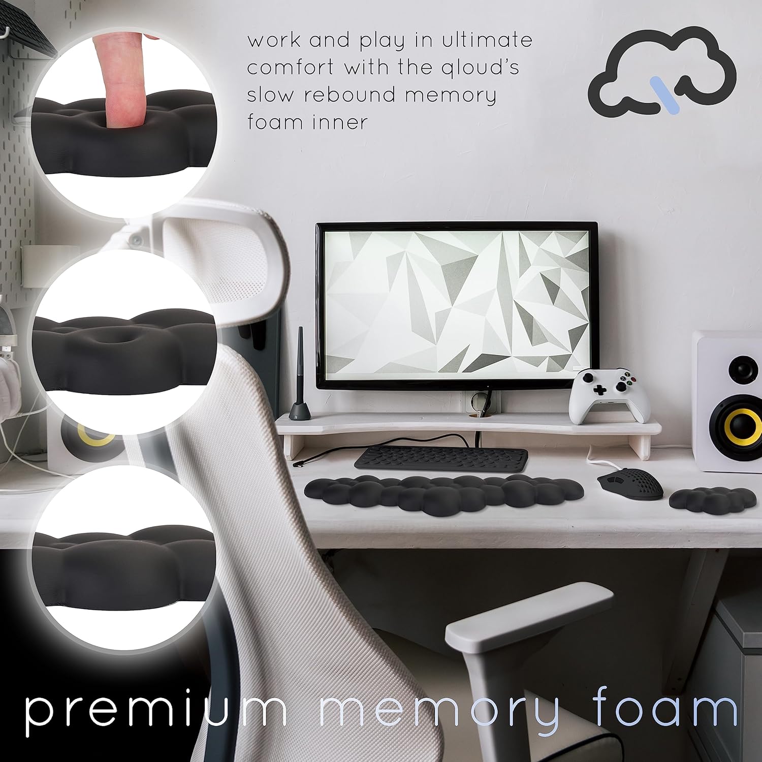 The Qloud cloud wrist rests is made with premium memory foam and is covered with a unique soft touch, milk silk material. You will know when you touch it!
