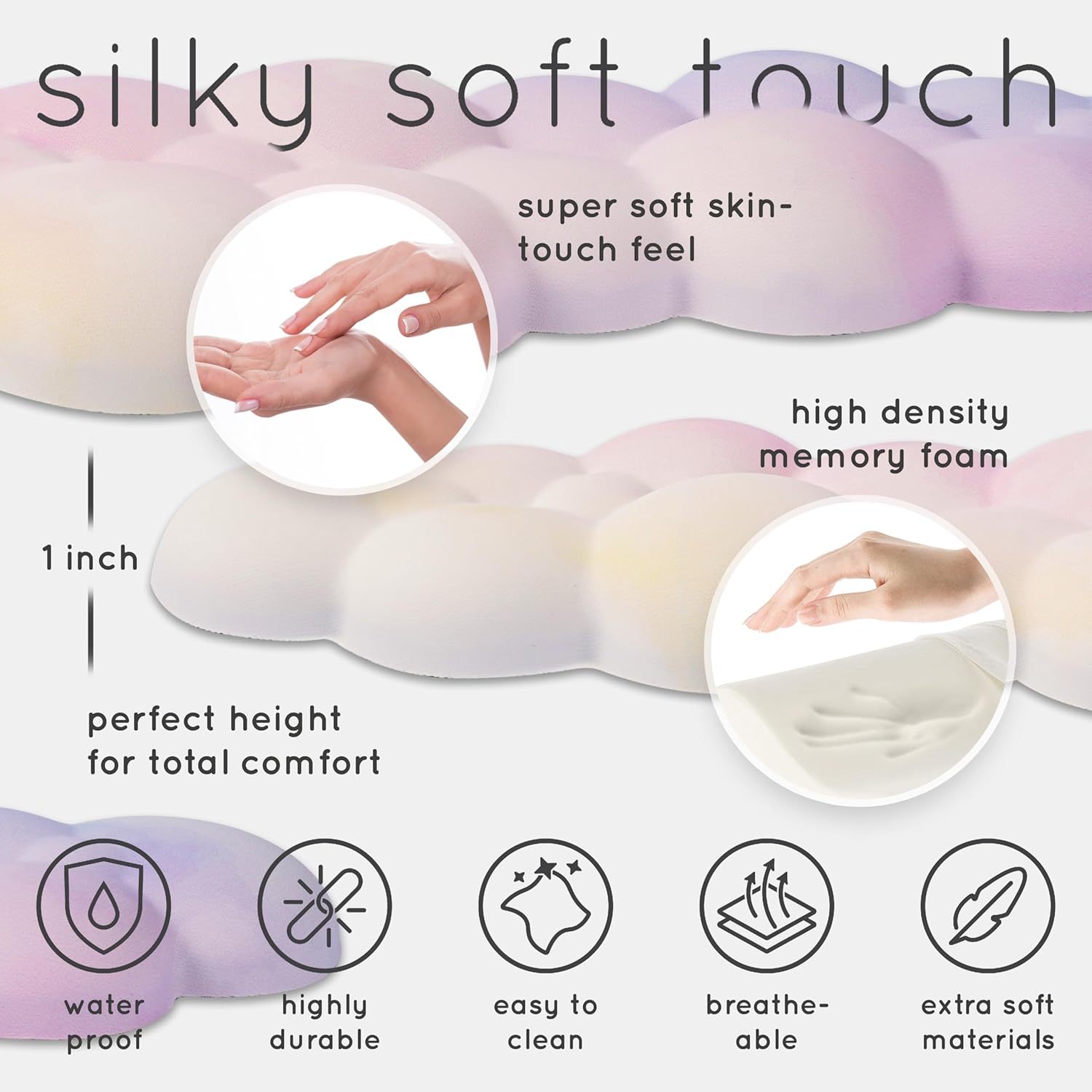 The Qloud cloud wrist rests is made with premium memory foam and is covered with a unique soft touch, milk silk material. You will know when you touch it!