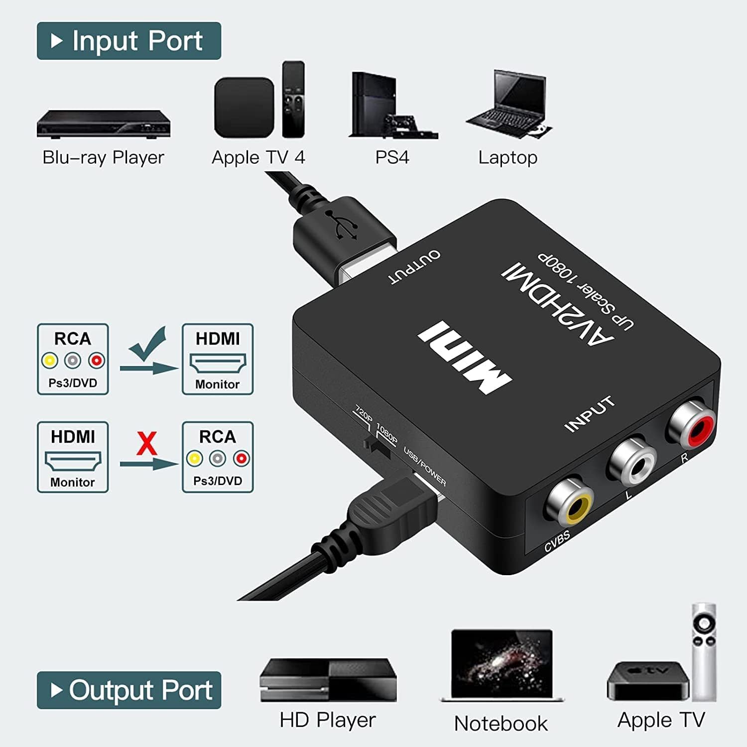 AV to HDMI Converter: Converts analog RCA composite input (red, white, yellow) to 720p/1080p (60Hz) HDMI output. You can get all your old gaming system output with RCA to HDMI Projoror/monitor!