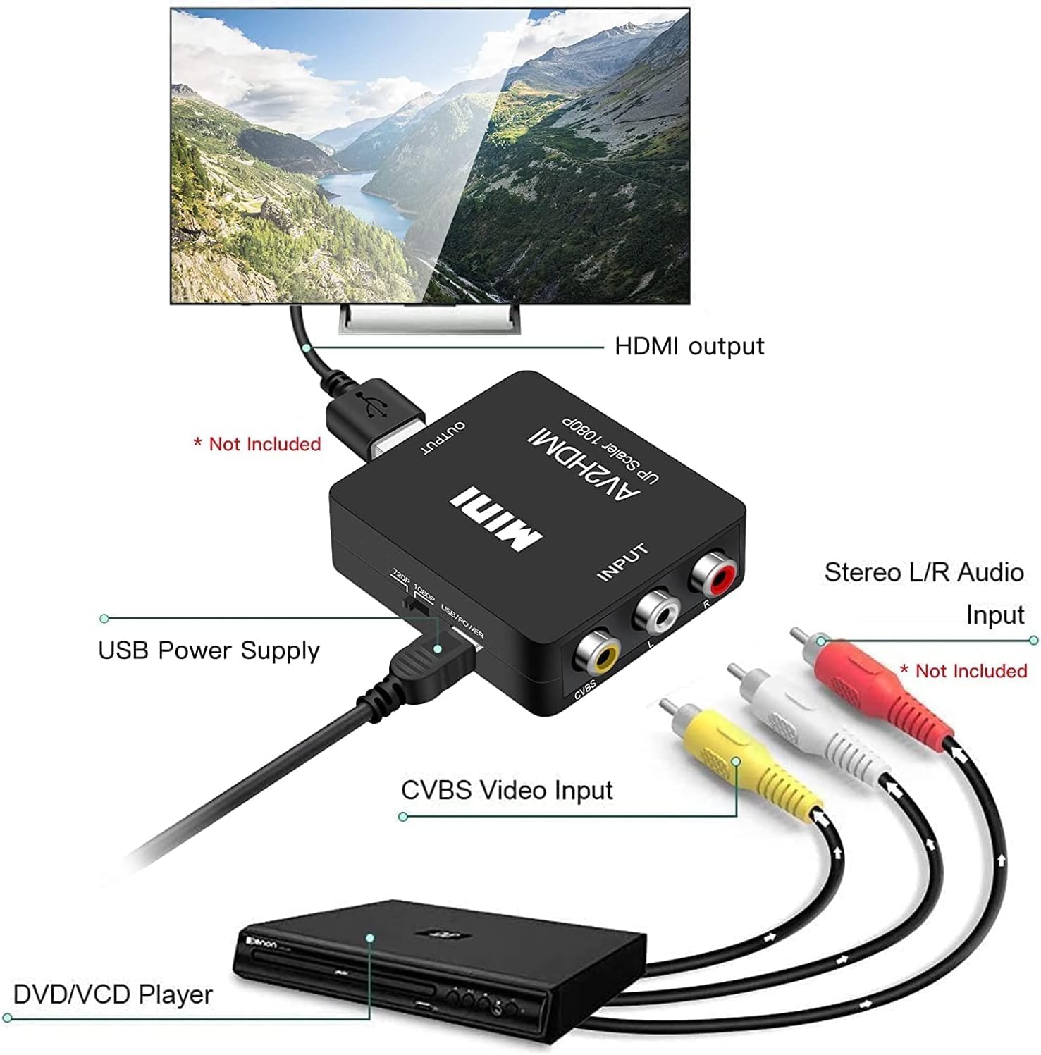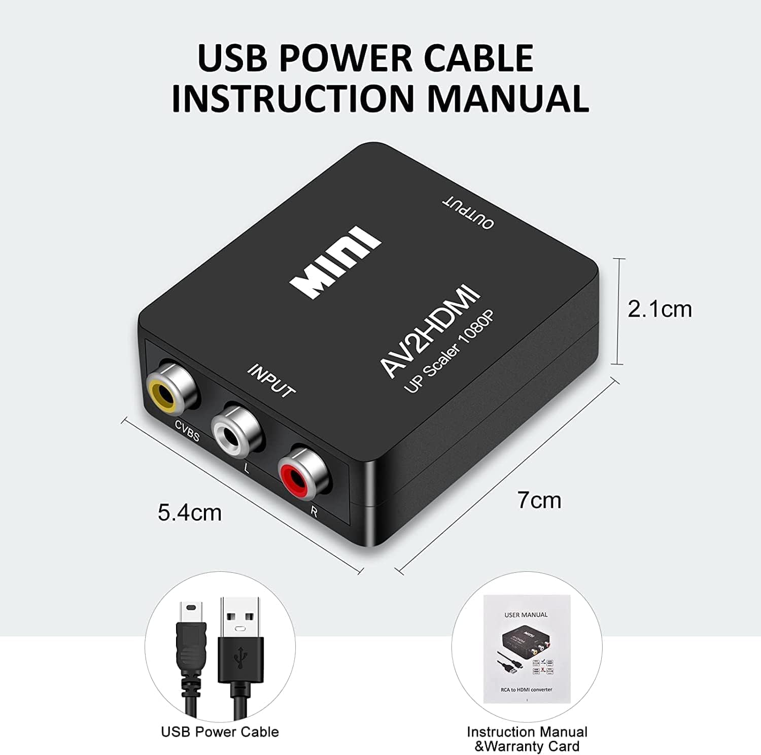 Plug and Play: Mini RCA to HDMI Converter Box does not need an extra driver, easy to use and easy to operate. Please connect the USB power cable (included) to 5V power supply when using this RCA to HDMI adapter.