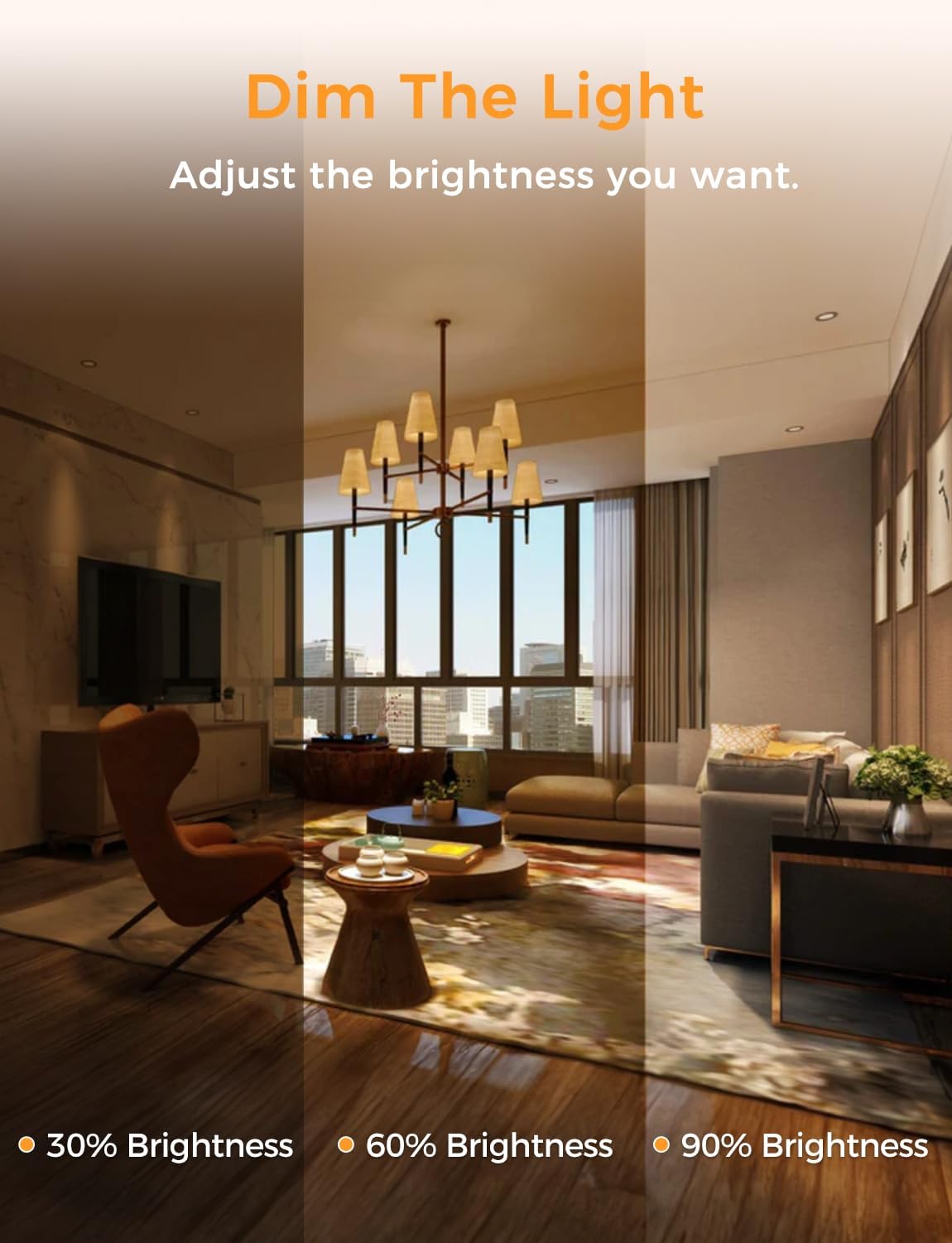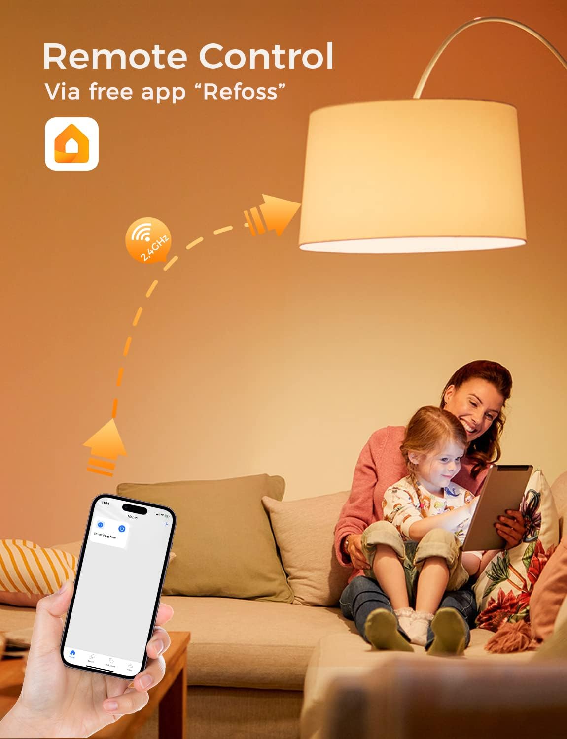 Voice Control: Refoss smart light bulbs 60 watts compatible with Apple HomeKit, Apple Watch, Siri, Alexa Echo, Echo Dot, and Google Home. Control your Alexa light bulb via voice command to turn on/off or dim/brighten your smart LED bulb effortlessly. E.g. ‘Hey Siri, turn the bedroom light to blue’