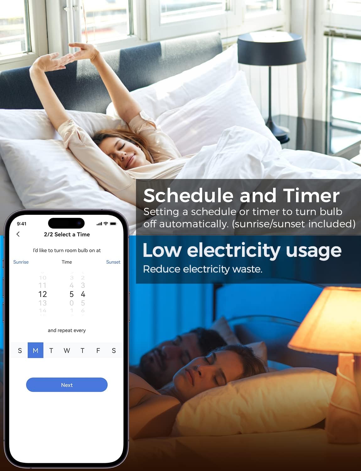 Schedules and Energy Saving: You can set schedules (timers) to turn on/off your smart rgb light automatically based on your routine. Sunrise/sunset mode supported. Only 9W of energy consumed, equivalent to the brightness of a 60W incandescent bulb