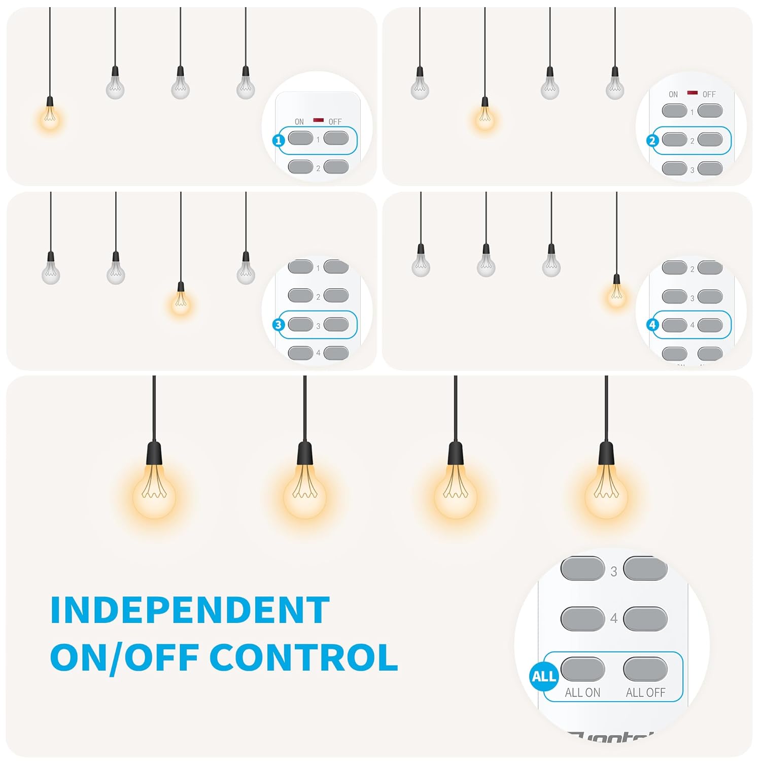 2 independent sockets: The remote control socket features 2 independent sockets; offer separate management for convenience without interfering with other devices; Added “All On” and “All Off” buttons on the remote allow for simultaneous control of all outlets with ease; Control multiple appliances with 1 mini remote in your hand