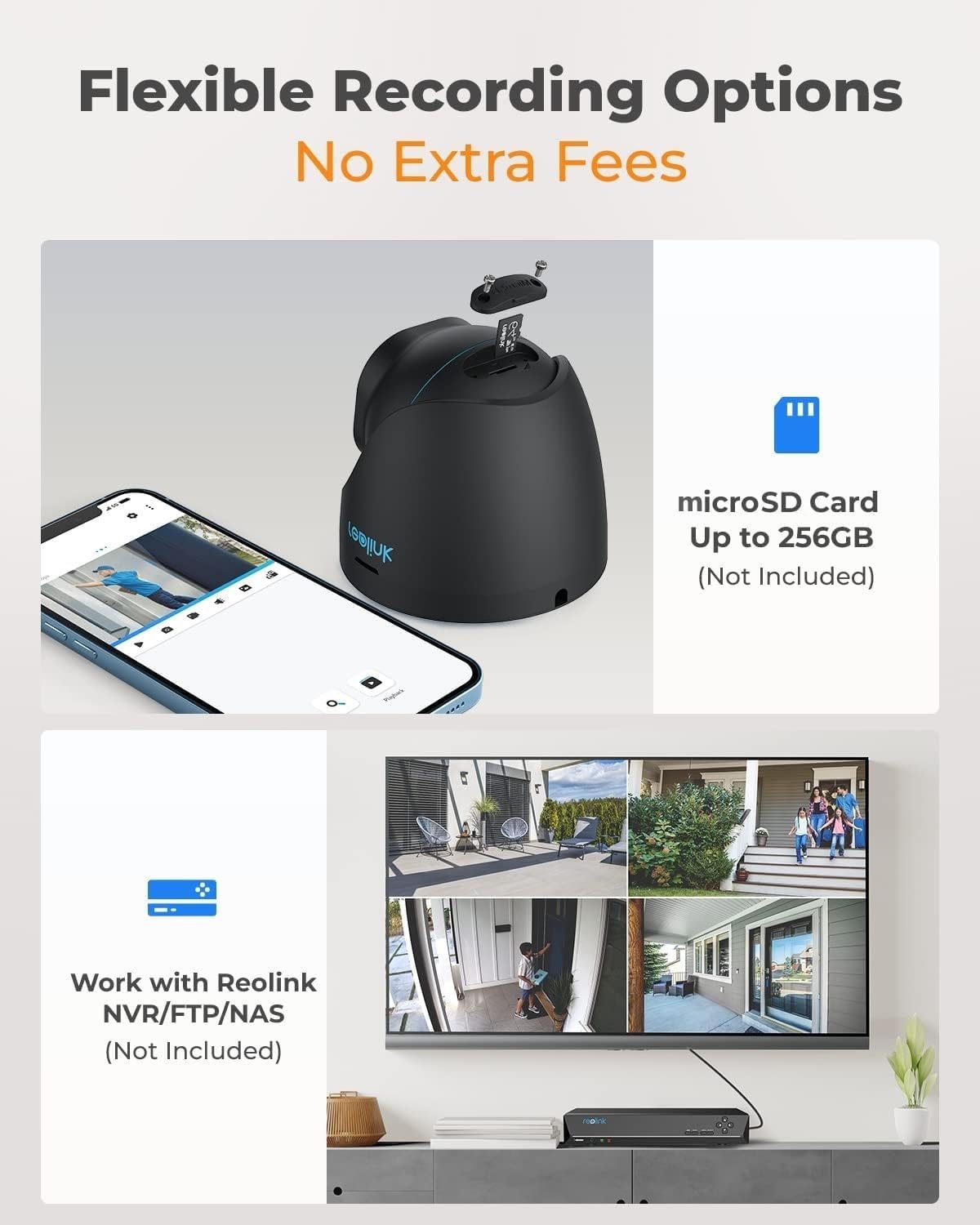 Multiple recording options: the CAM POE admits to record 24/7 continuously when the movement or during the scheduled time is detected. The videos can be saved on the micro SD card (up to 256 GB, not included), Reolink NVR or FTP Server.