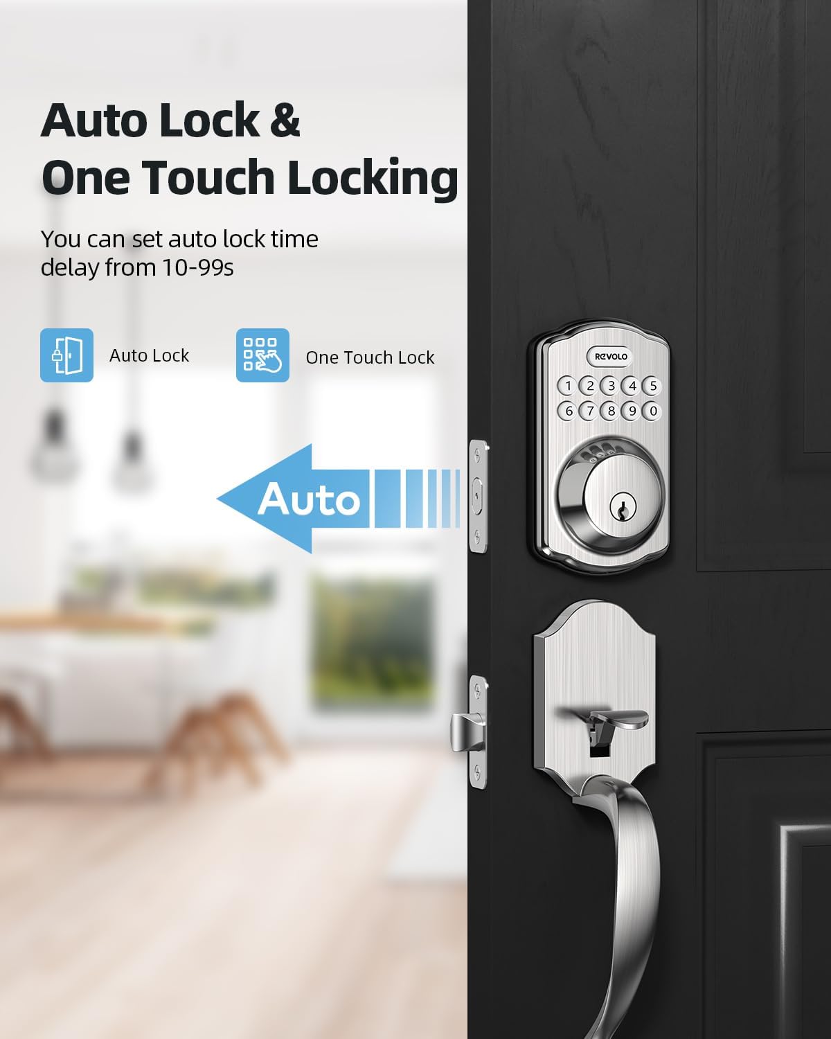 Self-blocked: Antipey password function guarantees the safety of your home, automatic blocking or touch blocking effectively avoids incomplete block. This keyboard door lock allows you to automatically establish 10-99 seconds or apply 1 by touching the motorized block, so you never have to worry about leaving your unlocked door