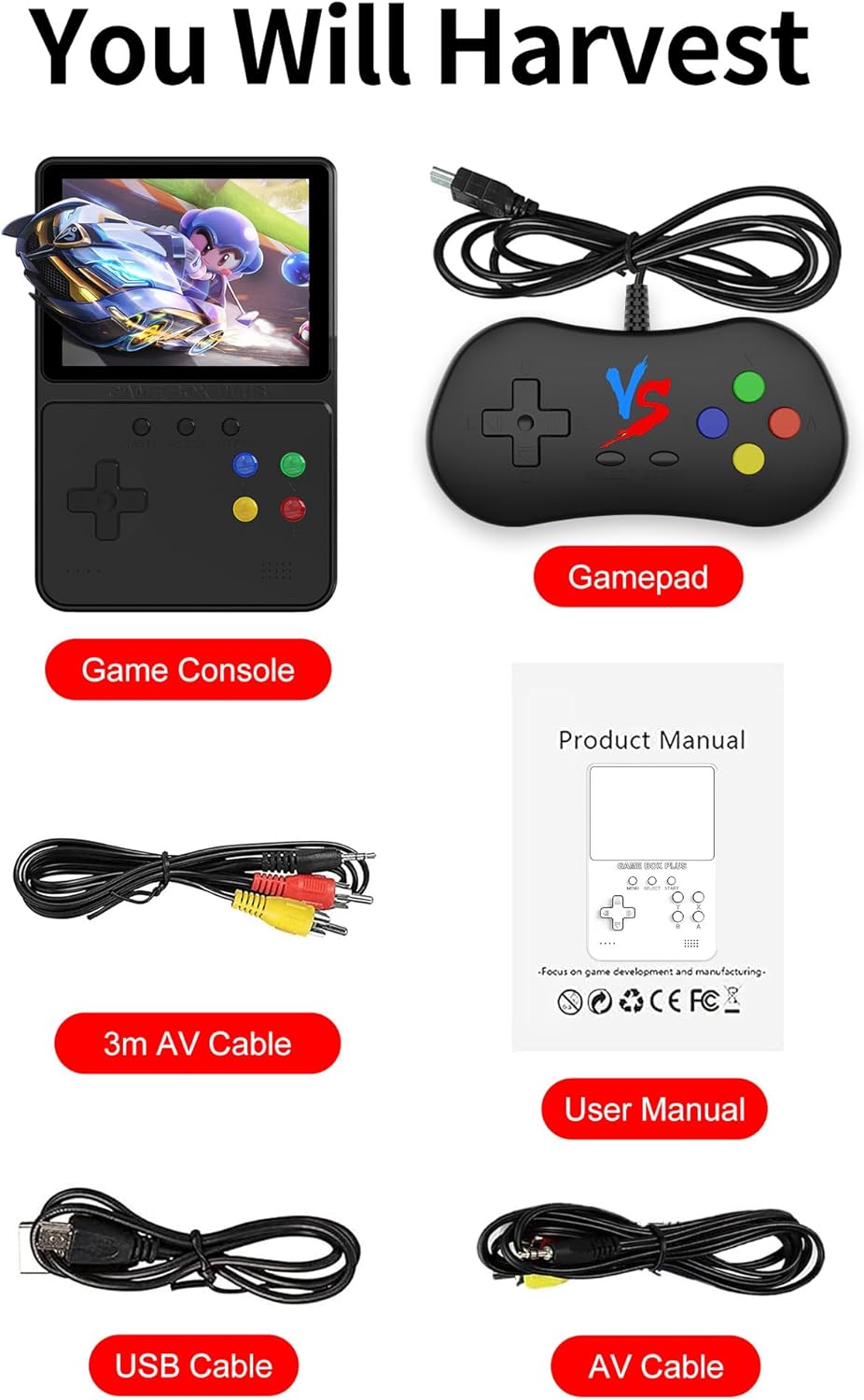 🎮🕹️📦 Package Contents 🎮🕹️📦: Your package includes a handheld game console, AV cable, DC cable, game handle, 1200 mAh battery and a user manual. Pick up this extraordinary portable game console today and embark on a gaming adventure like never before!