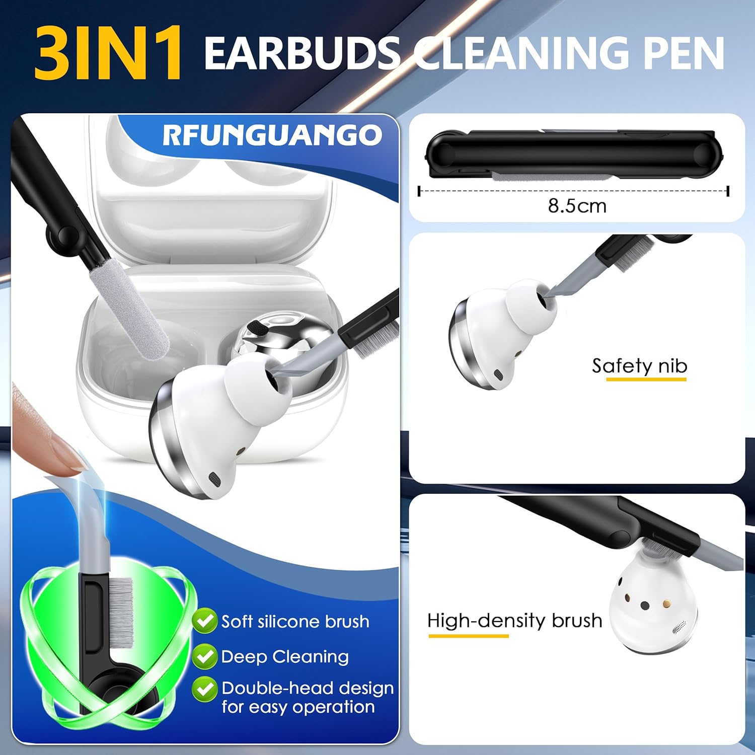 ✔【Multifunctional Cleaning Pen】: The Airpods cleaning kit has a silicone tip to remove dirt from crevices and hidden holes. The soft and velvety sponge absorbs fine dust inside the wireless earphone charging case. The high-density brush can easily clean dirt from the earphone sound hole.