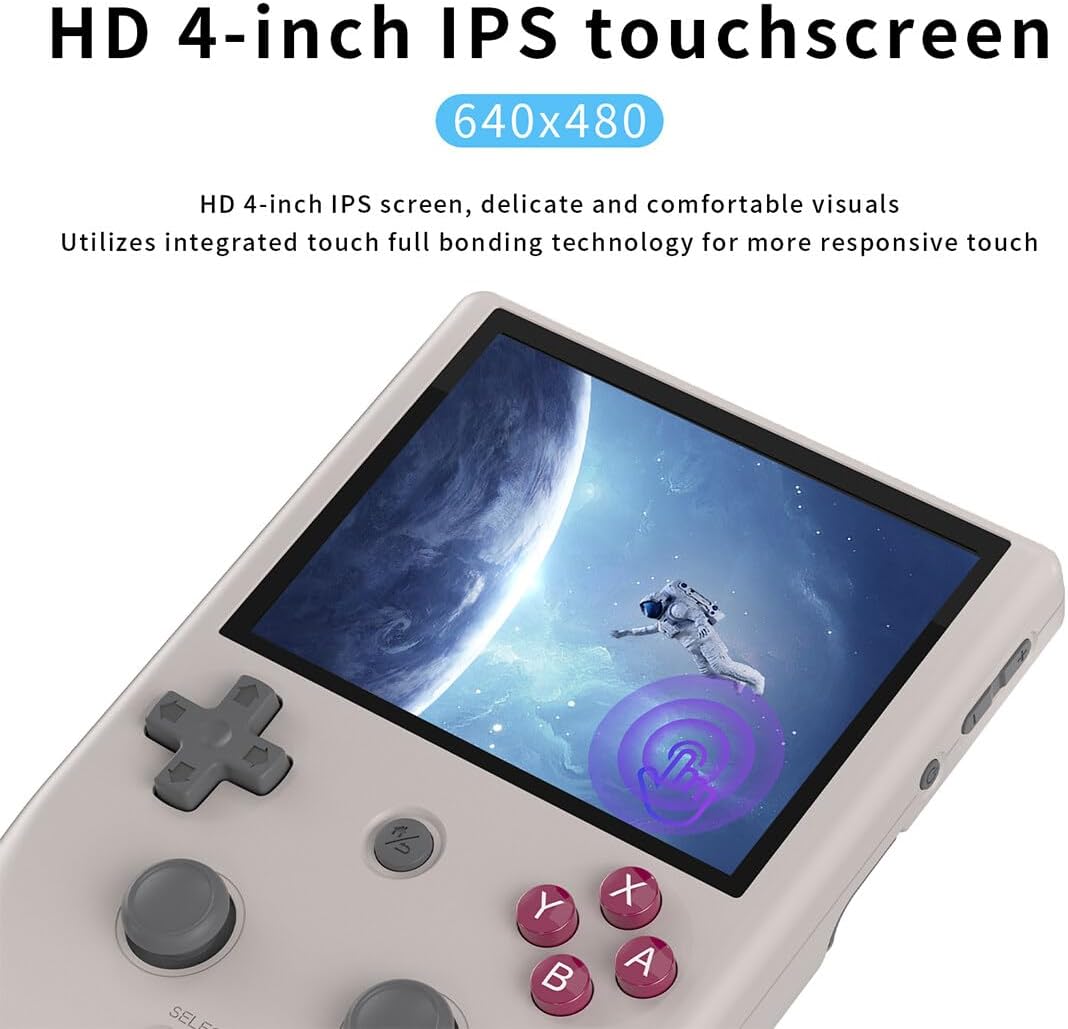 RG405V Retro Handheld Game Console: RG405V Android vertical handheld computer, ergonomically designed to reasonably fit in the palm of your hand and provide a comfortable grip. The automatic cooling design can cool down the temperature super fast, improve the performance of the machine and prevent game lags. Designed with a 4-inch IPS HD touch screen with 4:3 ratio and a resolution of 640*480, it integrates more sensitive touch full lamination technology.