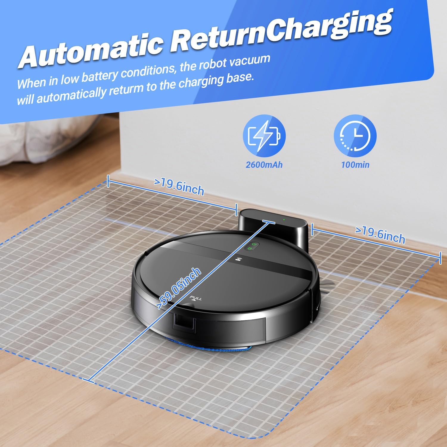 [100Min Runtime & Self-Charging] The robot's super-high capacity 2600mAh battery with up to 100 minutes of running time and a slim body of only 2.91 inches can clean all areas of your home in all directions. When cleaning is finished or the battery is low, it will automatically return to charging mode.