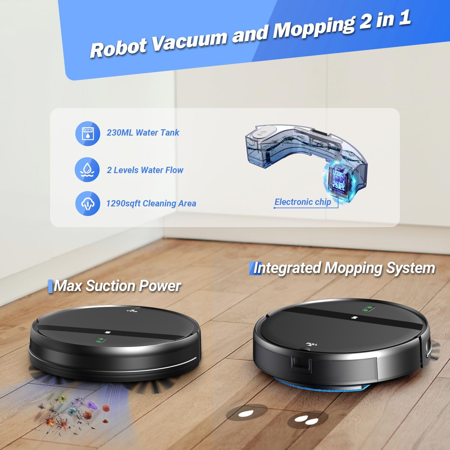 [2-in-1 Vacuuming and Mopping] Say goodbye to boring traditional robot vacuum cleaners! Our robotic vacuum cleaner combines powerful suction and mopping in one device. It ensures strong suction power and even mopping performance, removing dust and dirt effortlessly and giving your home a refreshing transformation.