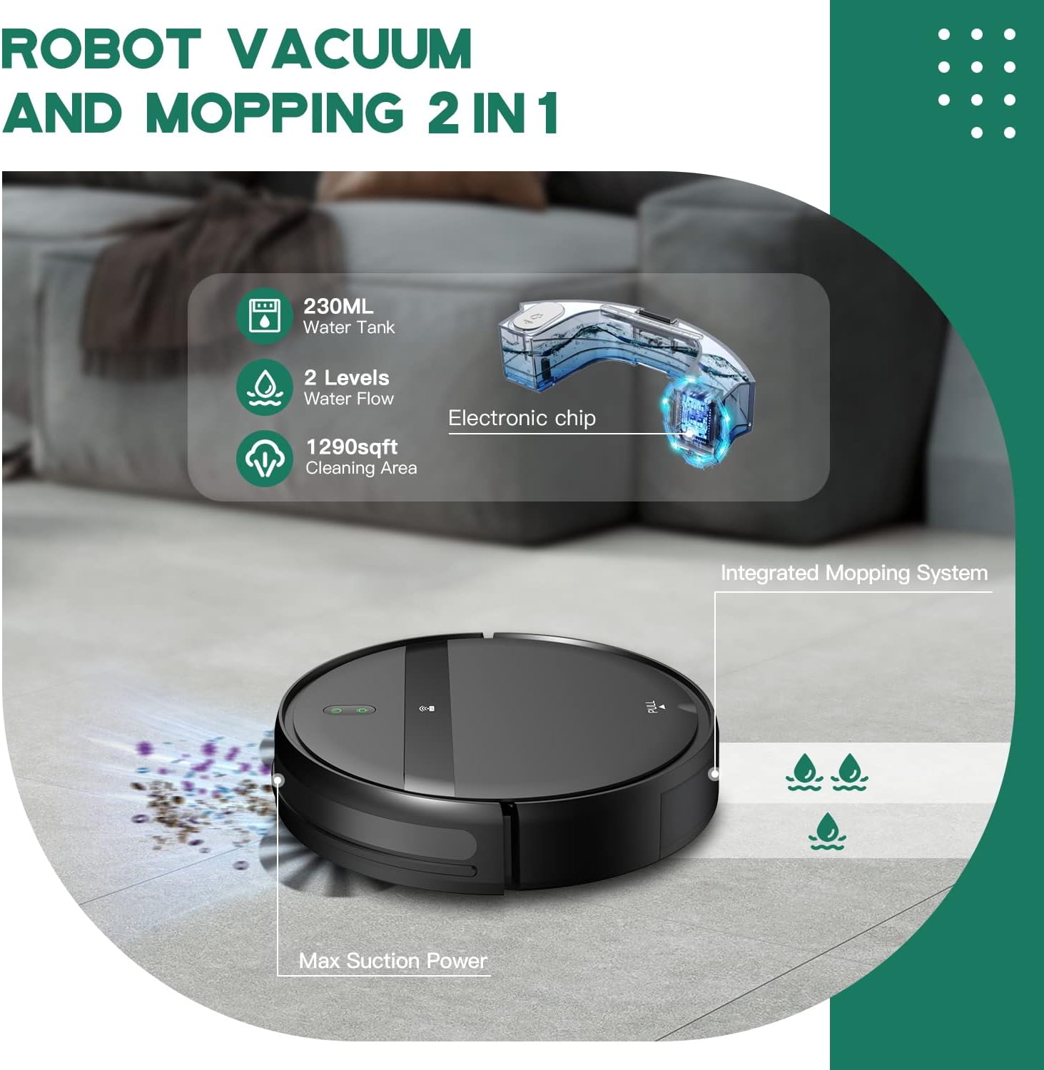 ✅ [2-IN-1 VACUUMING AND MOPPING] Experience ultimate cleaning convenience with our innovative robot vacuum and mop that effortlessly vacuums and mops your floors. It features a large tangle-free suction mouth that provides powerful suction, and an electronically controlled 230ml water tank that ensures even water filtration. With a run time of up to 100 minutes, it can clean surfaces spanning an impressive 1290 square feet.