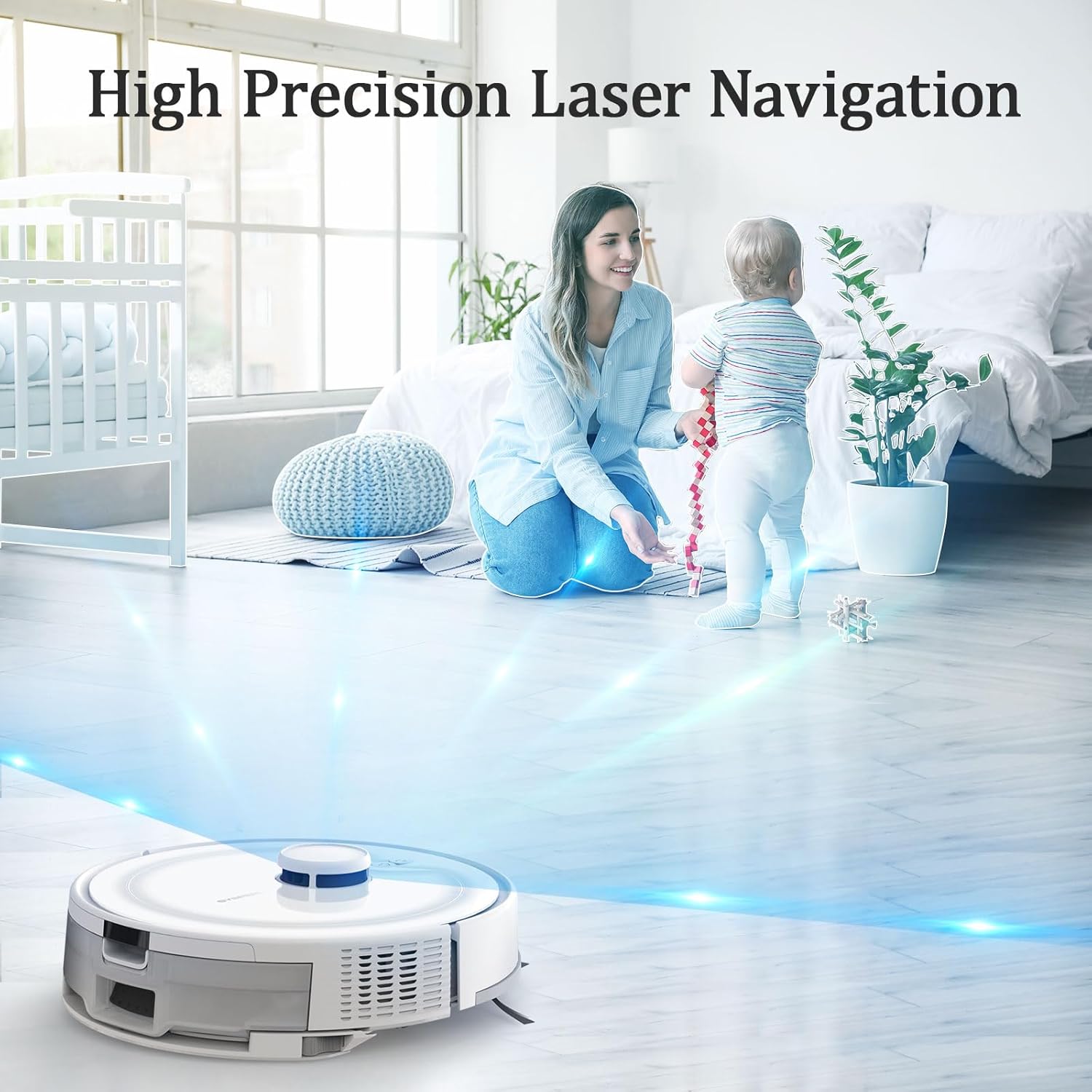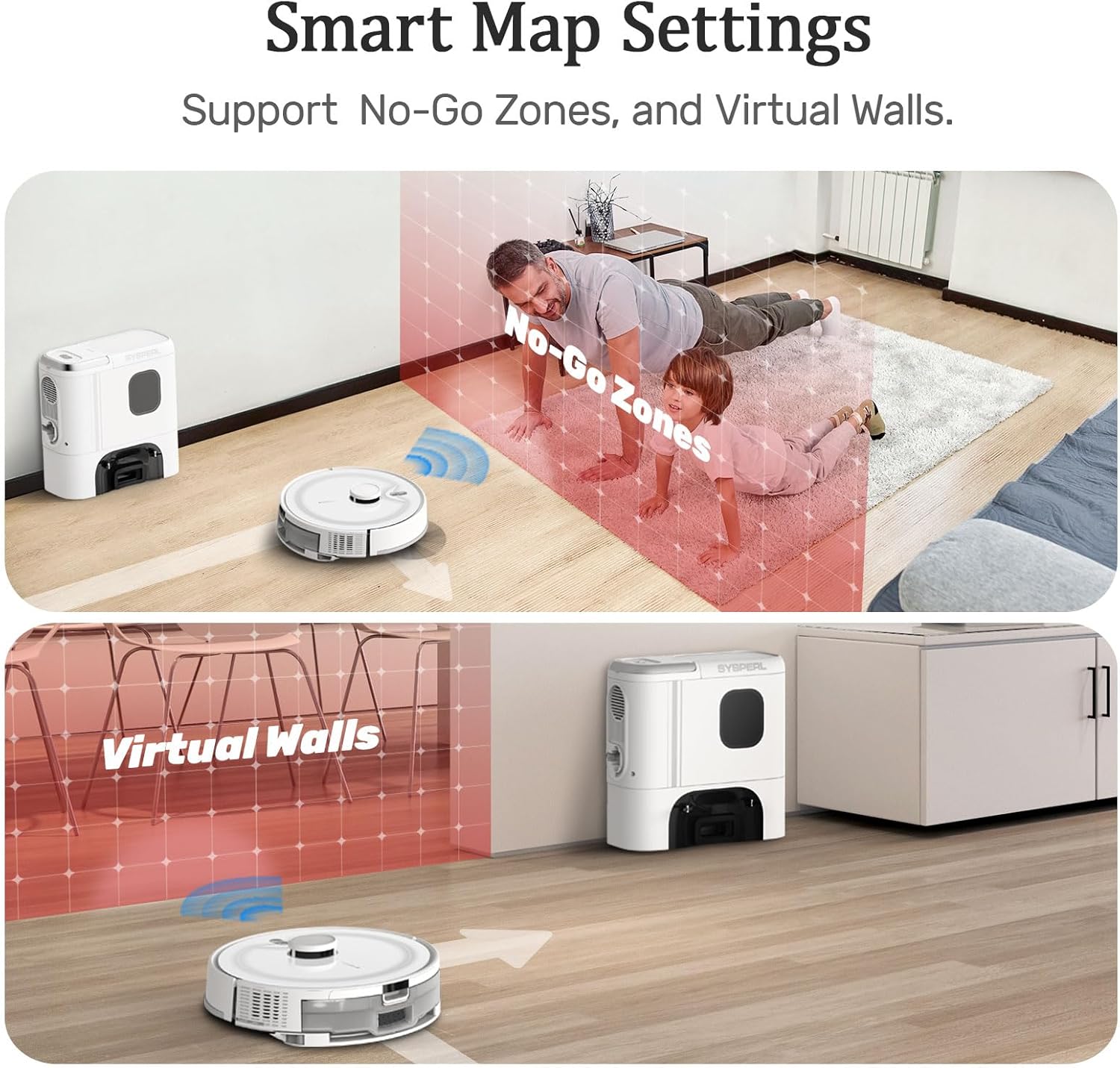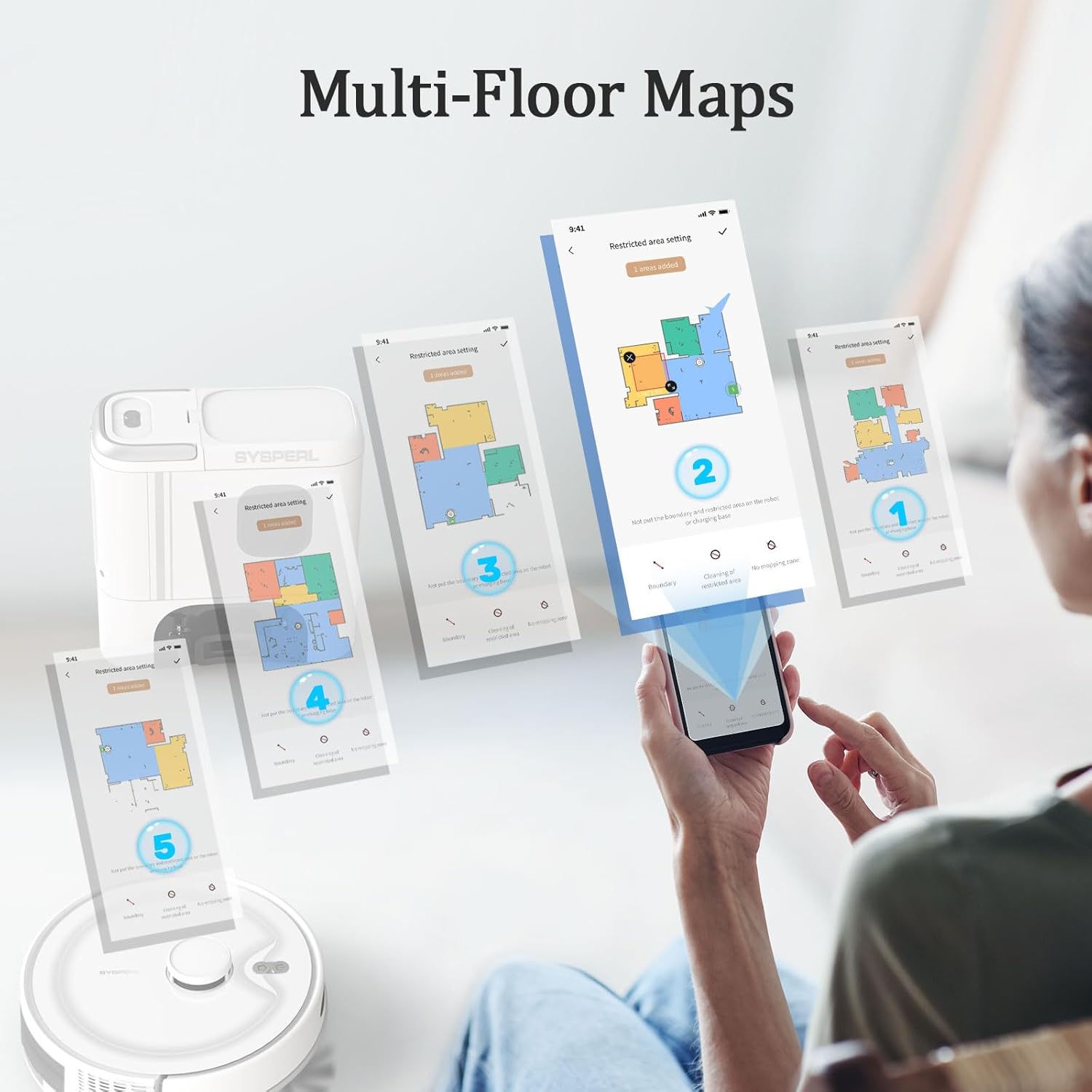 【Precise Navigation】 Innovative Laser SLAM technology with full body coverage sensors, 360° real-time scanning, 8M scanning range, after each cleaning, the Sysperl vacuum cleaner will automatically improve the map to provide accurate routes and reduce collisions with furniture.