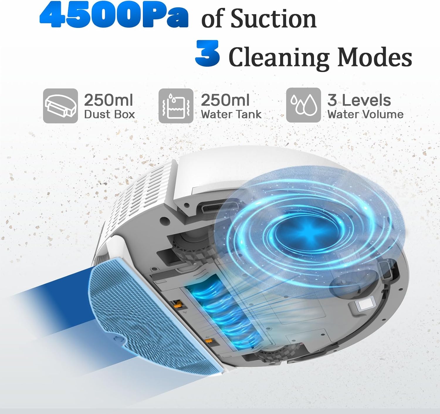 【Powerful suction】 4 levels of adjustable suction. Maximum power up to 4500 Pa, easily pick up hair, pet hair, paper, food scraps and other debris. When a carpet is detected, it will automatically increase the suction power to improve cleaning efficiency.