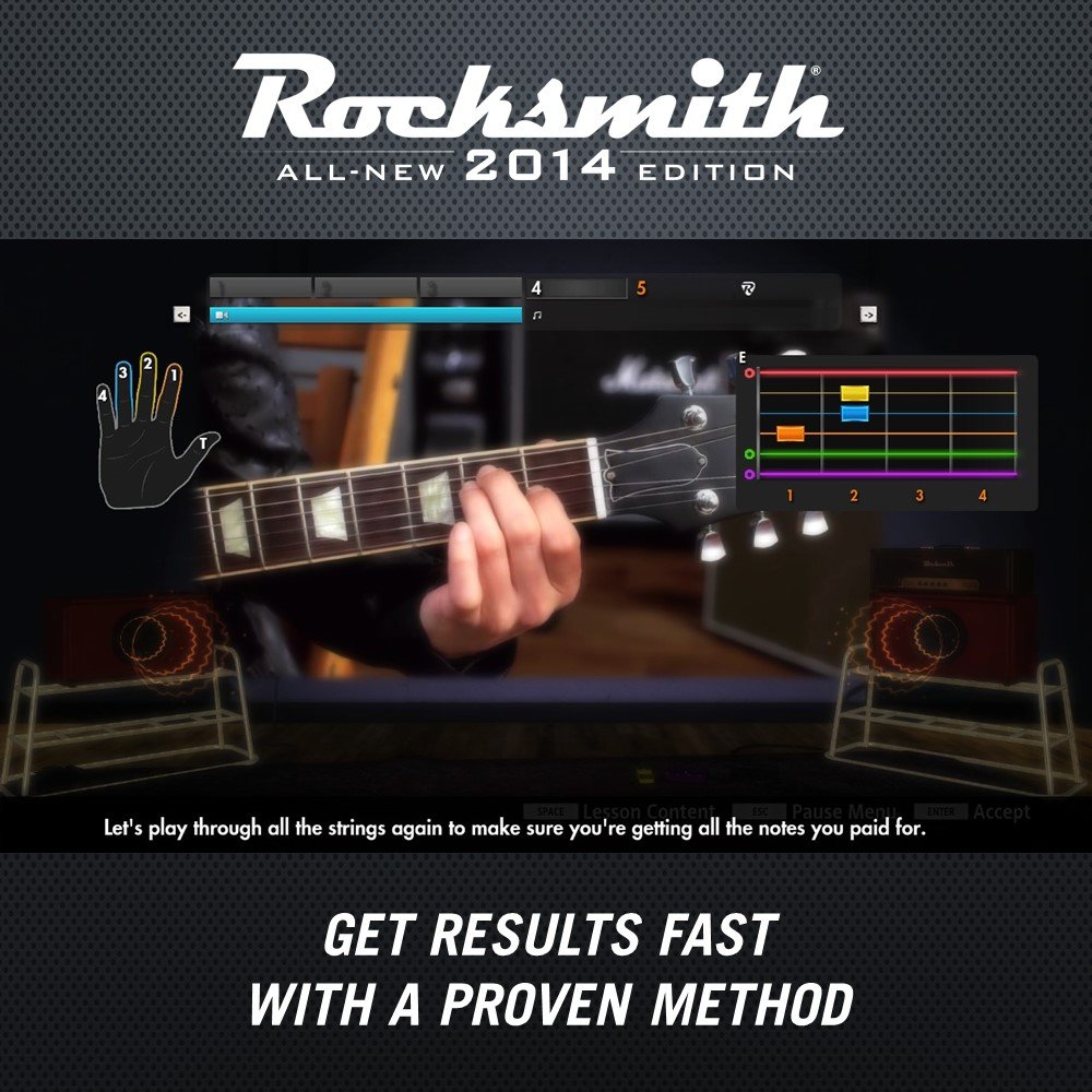 The new Rocksmith 2014 edition is bigger, better, and faster than ever. Rebuilt from the ground up, you’ll experience vastly improved response time, easy-to-use navigation, more flexible and deeper practice tools, new techniques and tunings, over 50 new hit songs, and much more.