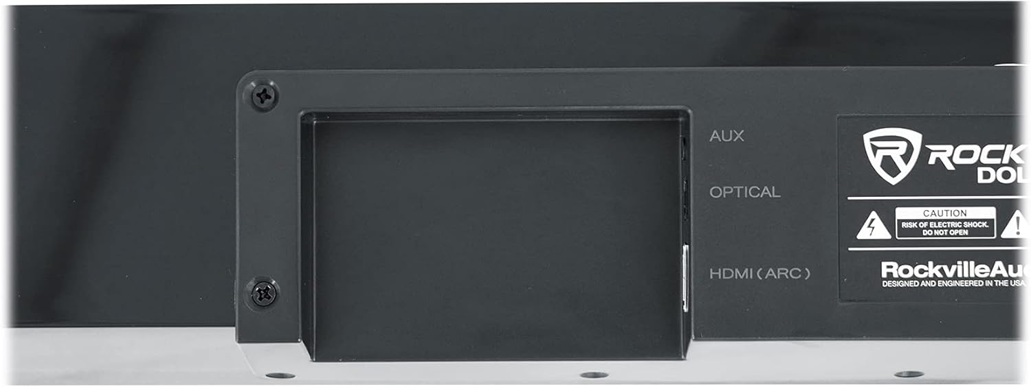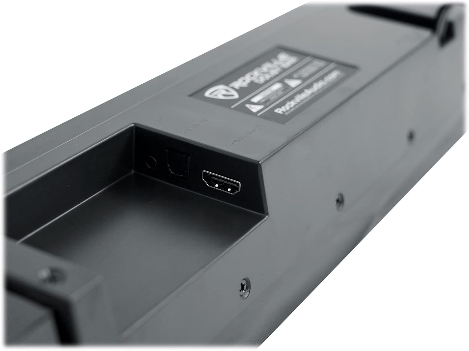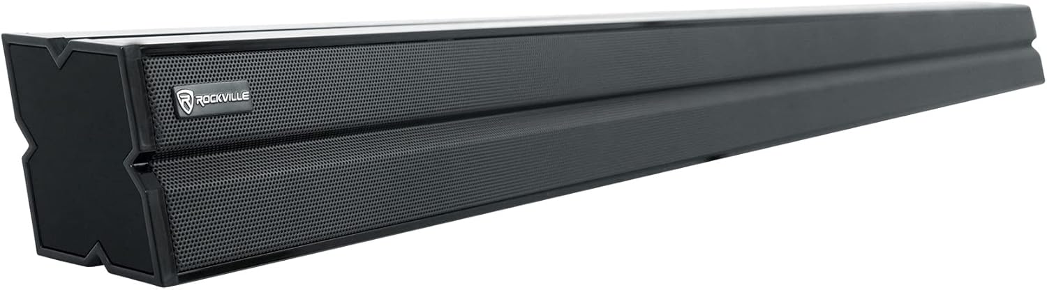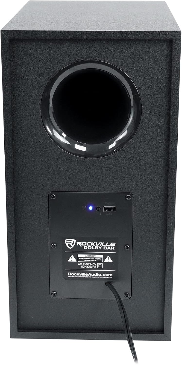Rockville DOLBY BAR 40″ 500-Watt Sound Bar with Wireless Subwoofer/Bluetooth/HDMI/Optical and Dolby Digital500-Watt Peak Power/200-Watt RMS Power (Continuous)Dolby Digital plus, Dolby Digital and Dolby Surround give you incredible Hassle-free cinematic experience when watching movies in pairs with included wireless subwoofer Built-in Bluetooth wireless audio streaming with long playback reach and distortion-free USB input plays music stored on a USB flash drive (up to 32Gb) Controls: Volume, Bass, Treble, DSP mode Includes a wall mount and mounting hardware Recessed input panel makes it easy to connect your device(s) Driver(s): The sound bar has (4) 2.25″ drivers and the subwoofer has one 6.5″ driver No distortion even at maximum volume The wireless subwoofer with driver 6.5″ delivers powerful, deep bass (1) RCA line input, (1) optical digital audio input, (1) digital USB input and an HDMI (ARC) LED display shows volume and track. Powered by a digital amplifier with DSP for audiophile sound quality. Remote control. Frequency response: 30Hz-20KHz. The wireless subwoofer and recessed input panel let you enjoy a neat, easy-to-install setup. HDMI (ARC): Easily connects to your TV. or other device with HDMI (ARC)DSP modes: Music, Movies, 3D, News 110/220-volt auto-switching power supply for worldwide use Unit Weight: 14.4 pounds Sound Bar Dimensions: 2 .75″ x 3.07″ x 37.8″ Subwoofer Dimensions: 6.7″ x 14.96″ x 12.05″