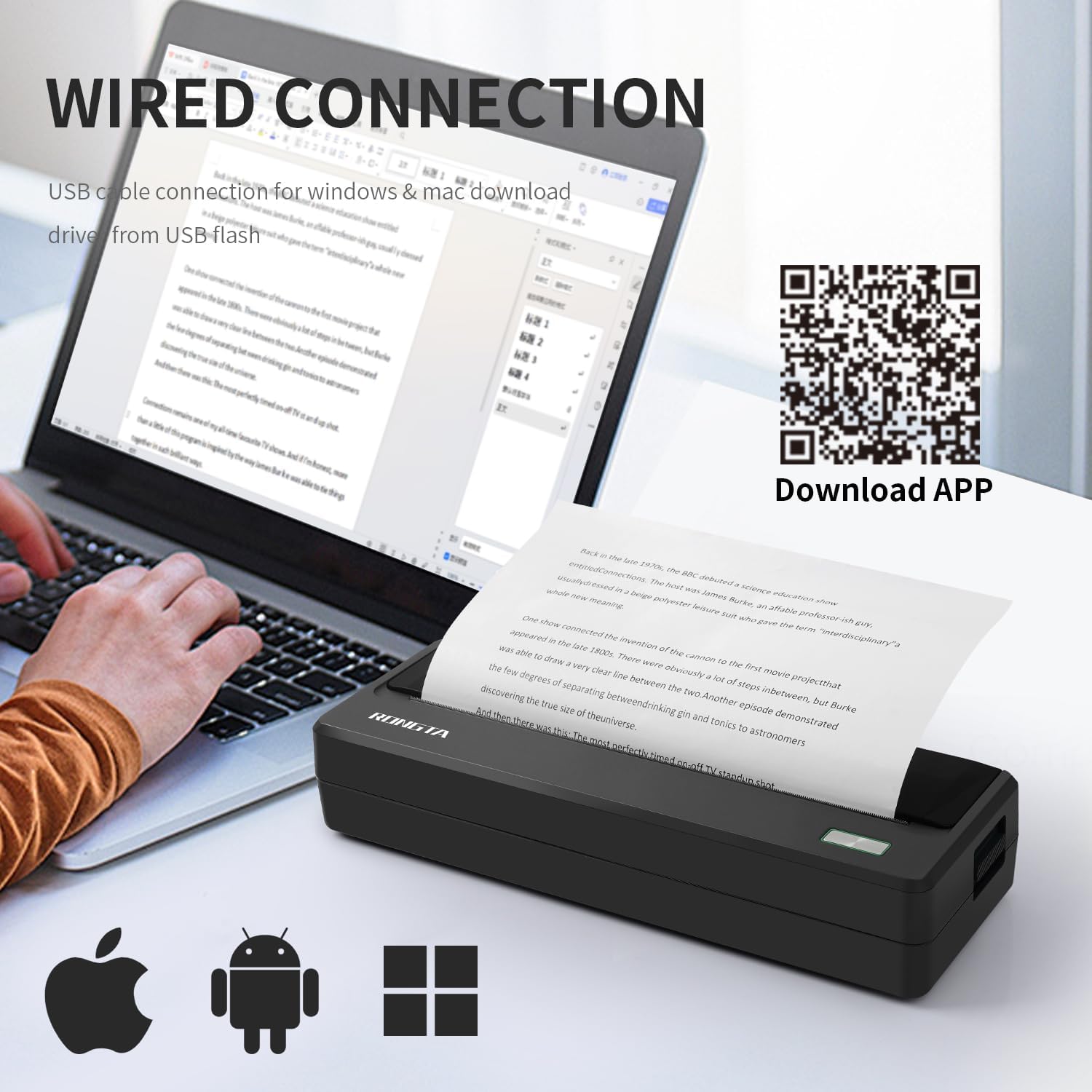 Wireless Bluetooth portable printer, easy to download SoPrint APP from Google Play or iOS APP Store. The A4 portable printer supports bluetooth connection for iOS and Android. Supports USB Type C connection for Windows 7 and above and MacOs