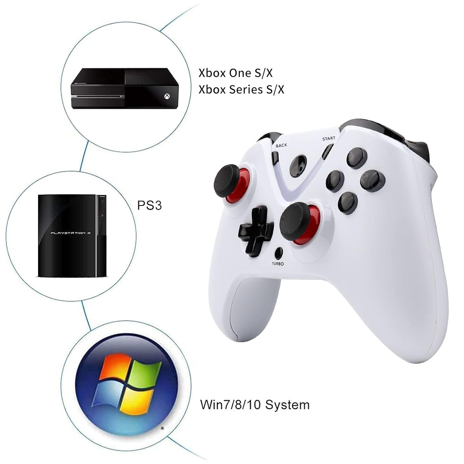 1. 2.4GHz wireless technology, effective distance about 33ft2. Support dual motor vibration; Equipped with lithium batteries, which work for up to 10 hours3. Supports Turbo function, making it easier for you to be the winner when you play arcade or action game4. No driver is needed and the controller will work when connected with XBONE, PS3 or PC.5. The button and joystick are responsive and the control is convenient6. Up to 2 wireless controllers can be connected to your console at the same time. You can enjoy the game even if the controller is charging.7. The 2.4G wireless receiver can be updated by software on a computer.