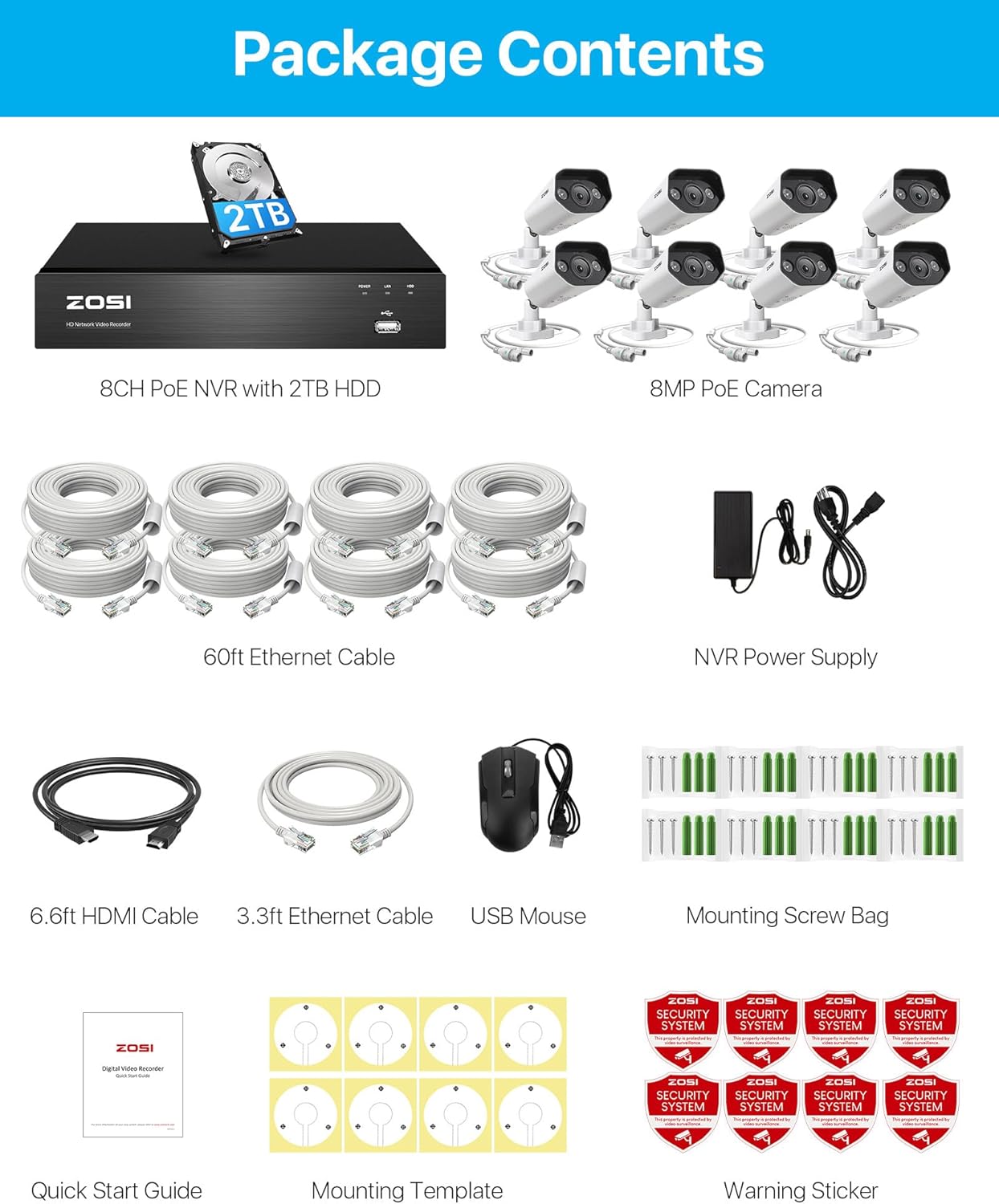【The NVR update of 4K 8 ports to 16ch expandable】 This NVR 4K 8 ports can admit up to 8 POE cameras. If you buy an additional Poe Zosi switch (not included), you can update it to a 16 channel system. It offers flexibility to add more cameras. You can add additional (only Zosi) 8MP, 5mp Poe Bullet or Dome cameras.